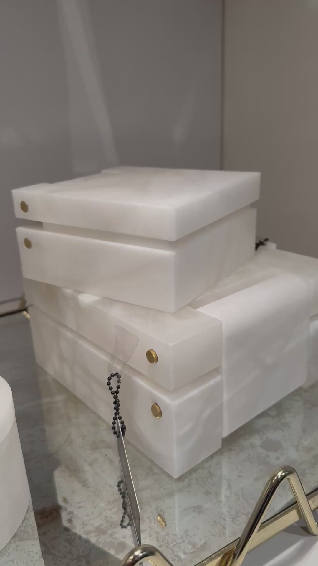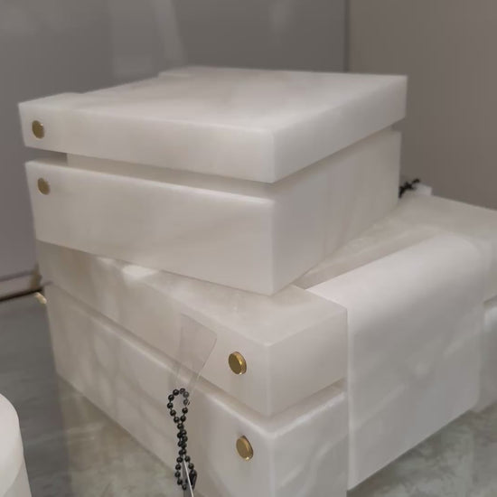 The Hinged Alabaster Boxes Set in White by Global Views are handcrafted from natural Italian alabaster and accented with brass hinges. Each box features distinct veining and color variations, making every piece one-of-a-kind. They are a beautiful blend of natural elegance and timeless design.