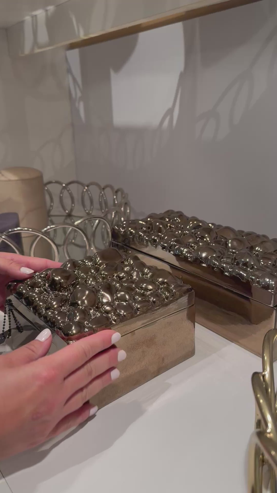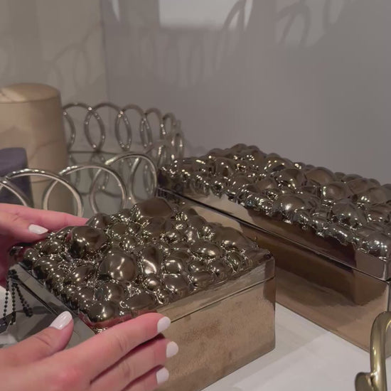 The Pebbles Boxes Set in Bronze by Global Views are crafted from slip-molded Portuguese ceramic, showcasing a bold bronze glaze that adds a distinctive flair to any setting. These versatile boxes are perfect for storing small items or serving as decorative accents, bringing a touch of modern sophistication to your décor.