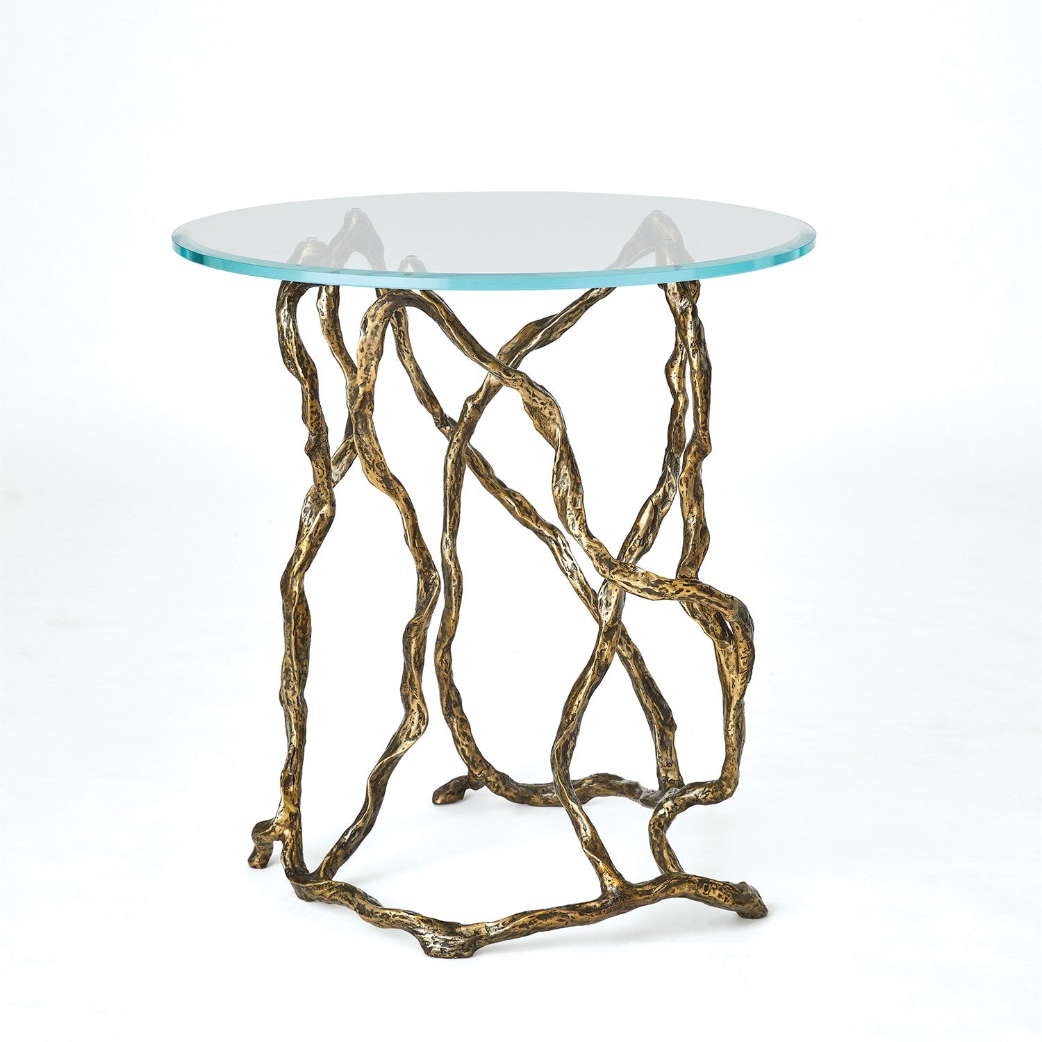 The Twistwood Side Table in Antique Brass by Studio A for Global Views is expertly crafted from cast iron and features an antique brass finish. This piece elegantly merges natural elements with sleek tempered clear glass surfaces for a refined, sophisticated look.