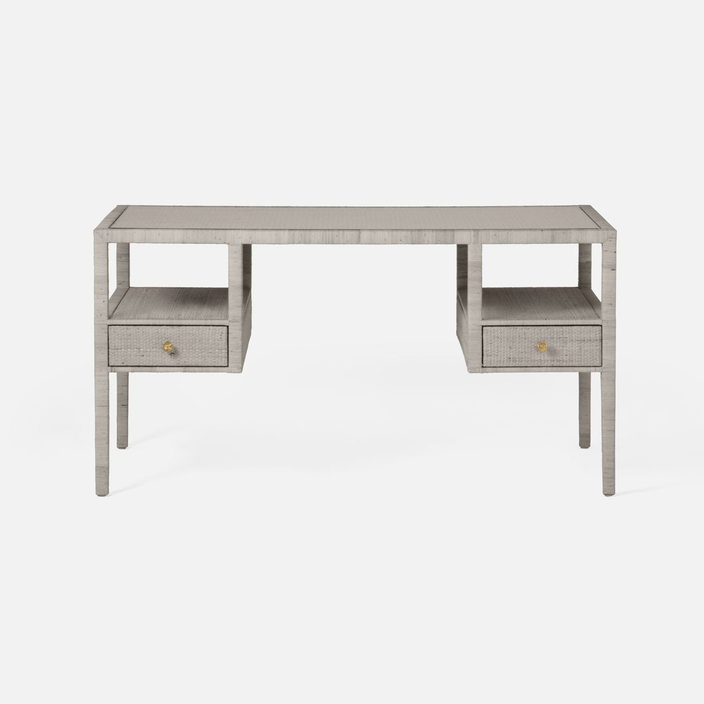 The Isla Open Shelves Desk in French Gray by Made Goods has a tightly-wrapped, natural peeled rattan frame. Its slender legs are reinforced by a box stretcher and support a densely woven basketweave top. For protection against everyday spills and stains, a glass piece is included. The desk also includes soft-close front drawers with flower-patterned gold knobs.