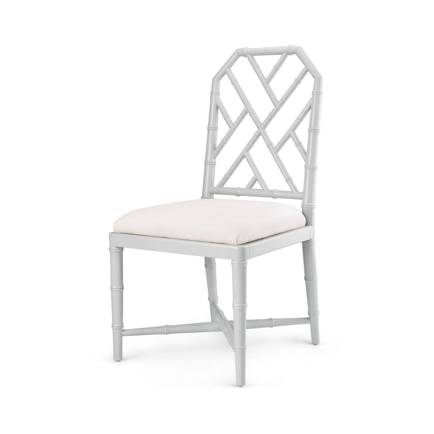 The Jardin Side Chair in Pewter from Villa & House is made of solid mahogany in the Chinoiserie style and finished in a gray lacquer. Chic design details include an elegant faux bamboo frame, lattice frets, and tapered legs, allowing this chair a sophisticated and graceful line. Simple drop in linen upholstery recovers easily when it comes time for a change. *Sold in a set of two.