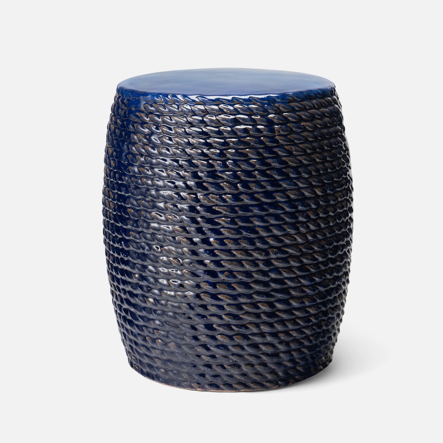 What appears as a detailed rope stool is actually outdoor-ready ceramic - expertly molded & glazed. The Adrian Stool in Royal Blue Stoneware from Made Goods features hand detailing of real rope shining through.