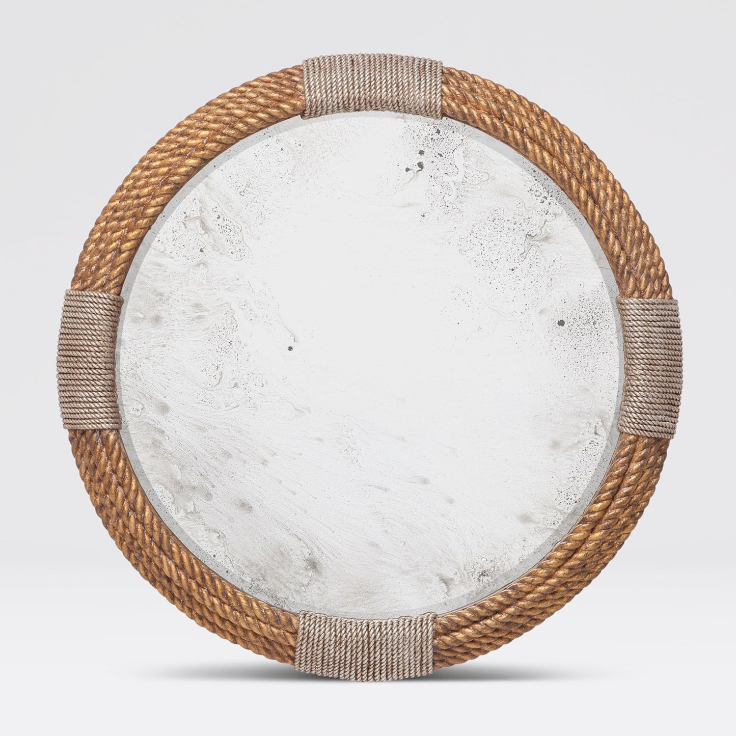 Achieve a sophisticated nautical aesthetic in any room with the Alexander Mirror in Gold Rope from Made Goods. Its antiqued finish and natural braided rope detailing create the appearance of looking out a ship's portal.