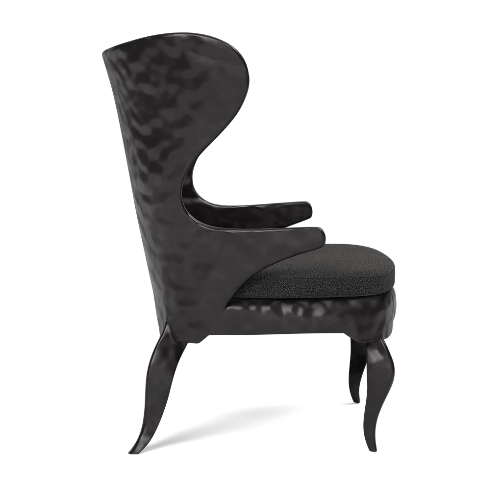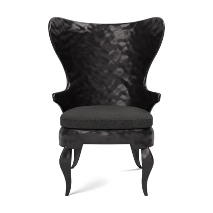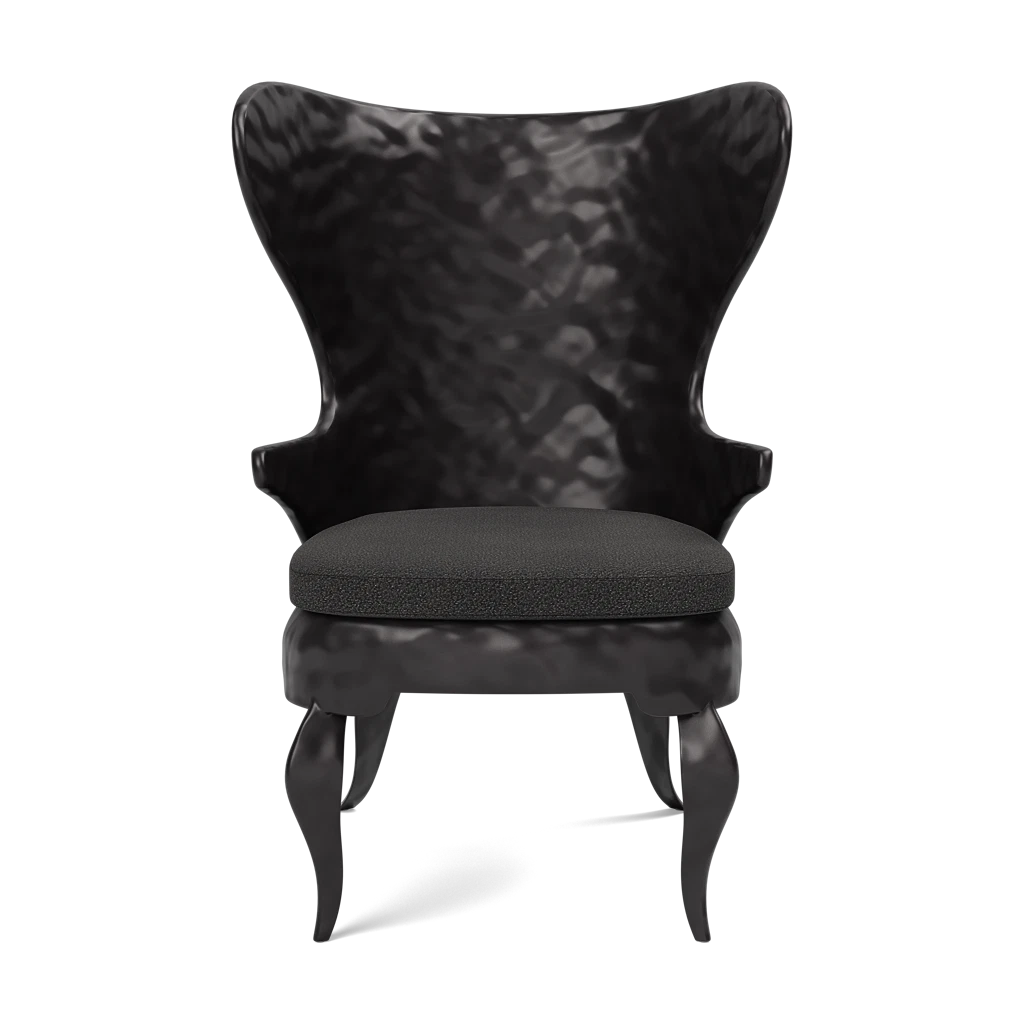 The Alfred Upholstered Chair in Hammered Blackened Iron from Made Goods boasts a striking silhouette and expertly crafted hammered metal for a truly impressive addition to your living space. It is upholstered in Marano Dark Gray Wool on Lambskin, providing both comfort and style.