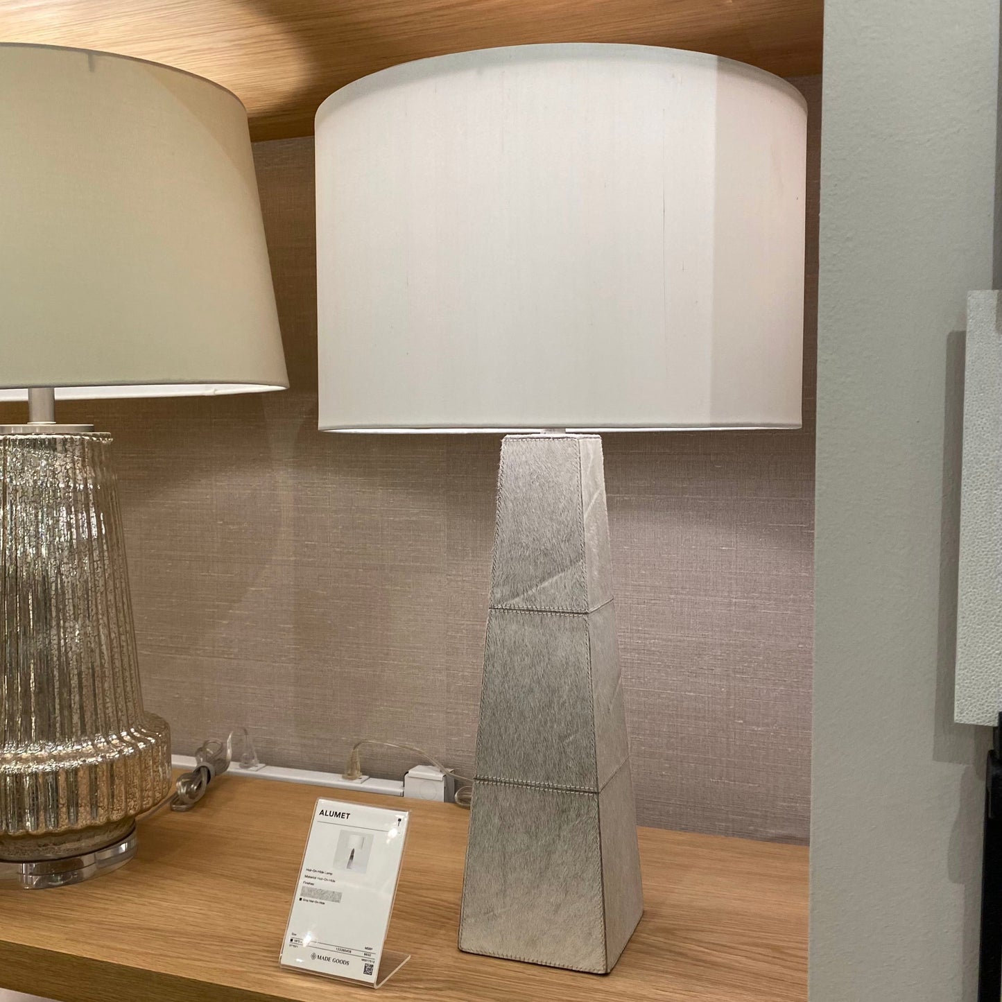The Alumet Table Lamp in Gray Hide from Made Goods showcases a graphic design created by piecing together rectangular panels of hair-on-hide, accentuating the contrasting shades of this luxurious material.