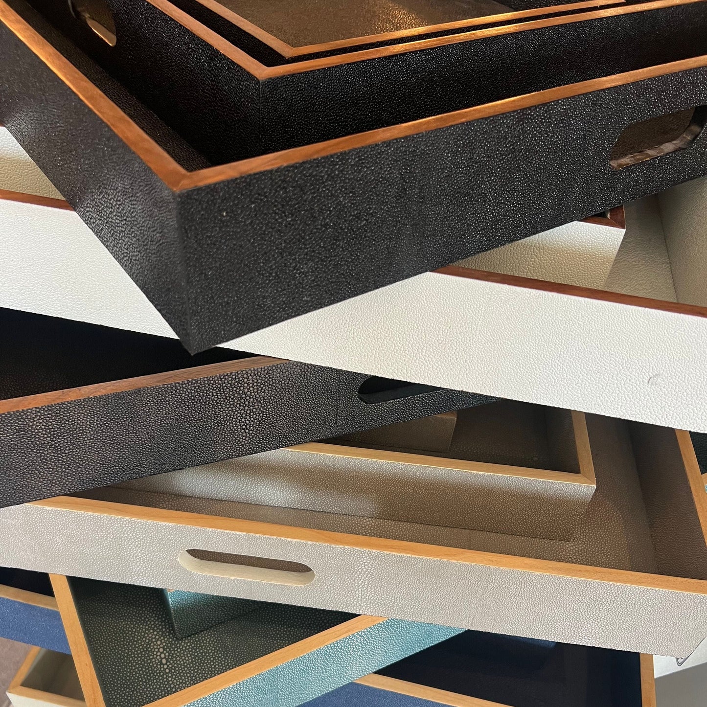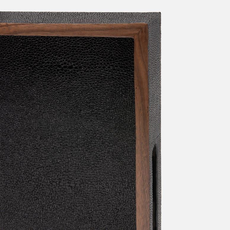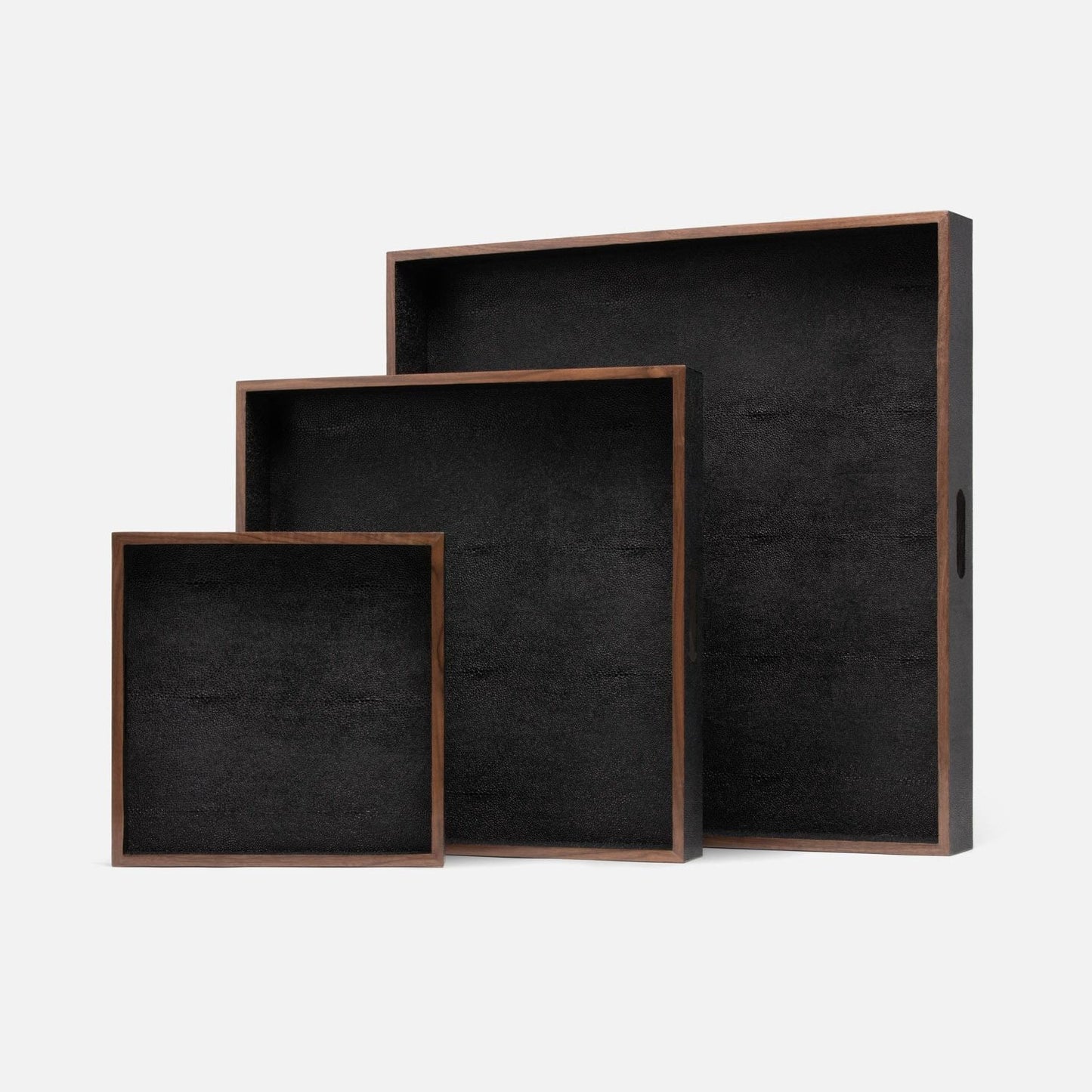 Streamline your space with the Amina Tray Set in Black Faux Shagreen from Made Goods. This set includes three trays, each with a unique size and design, featuring faux shagreen and wood accents.