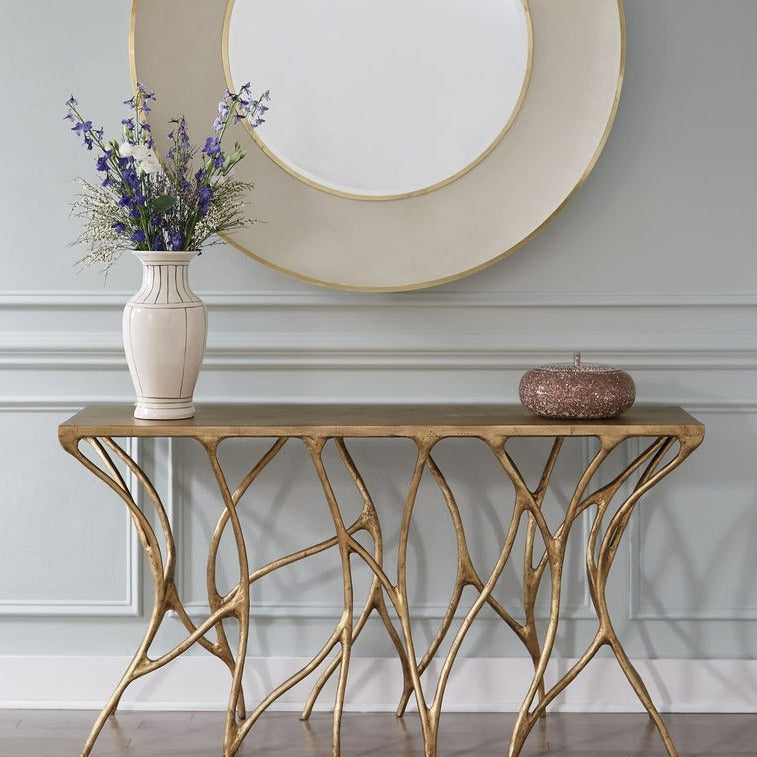 Improve your home decor with Made Goods' Armond Mirror in Snow and Brass. This impressive mirror boasts a robust frame and a concave round shape, providing versatile options for various wall spaces.