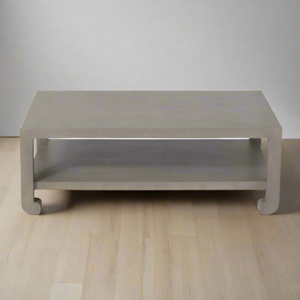 The Askel Coffee Table in Seal Faux Raffia from Made Goods is made of textured faux raffia in subtle colors and designed with traditional Chinese furniture shapes in mind. The Askel features expert craftsmanship as seen in its rounded edges, straight legs, wrapped feet. This functional yet elegant coffee table reflects an elevated taste level and awareness of modern interiors.