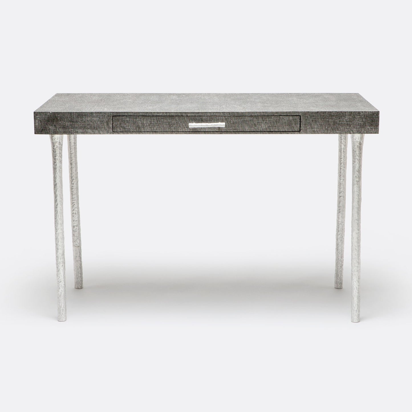 Crafted with a rectangular shape, the Audrey Desk in Charcoal Faux Linen by Made Goods offers a convenient drawer for storing writing materials, pens, stamps, and electronics. The desk also features a natural, textured finish on the legs and metal handles, making it a standout piece for any home or office setting.