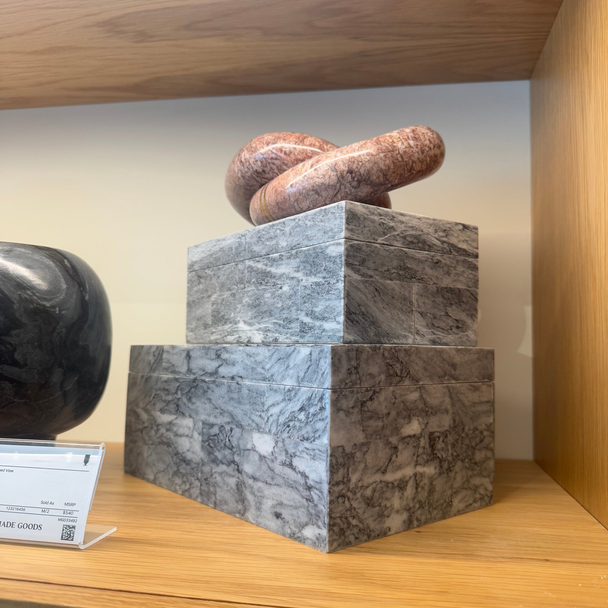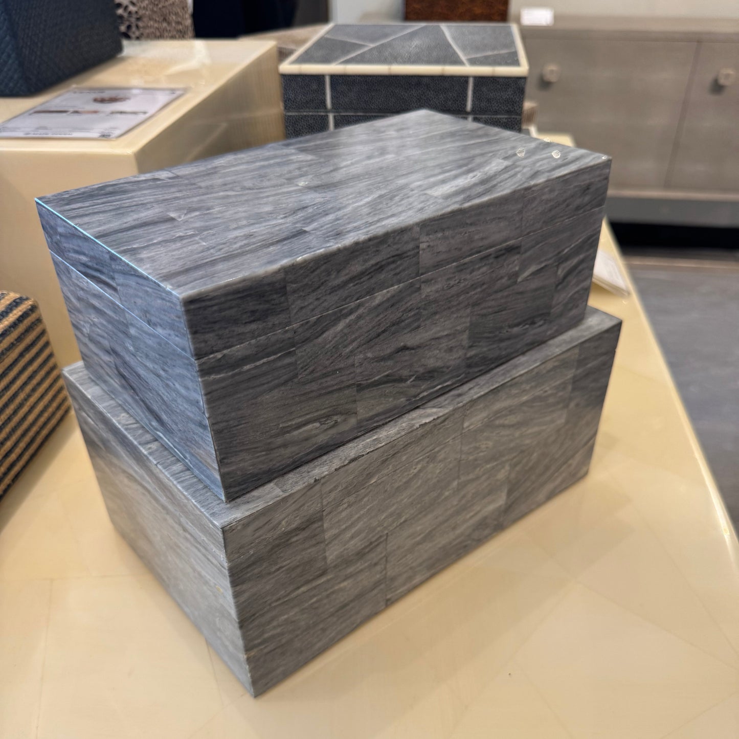 The Bacall Box Set in Gray Stone from Made Goods delivers luxurious style and functionality. This breathtaking box set has a surprise inside-a gorgeous marble interior to match its exquisite facade.