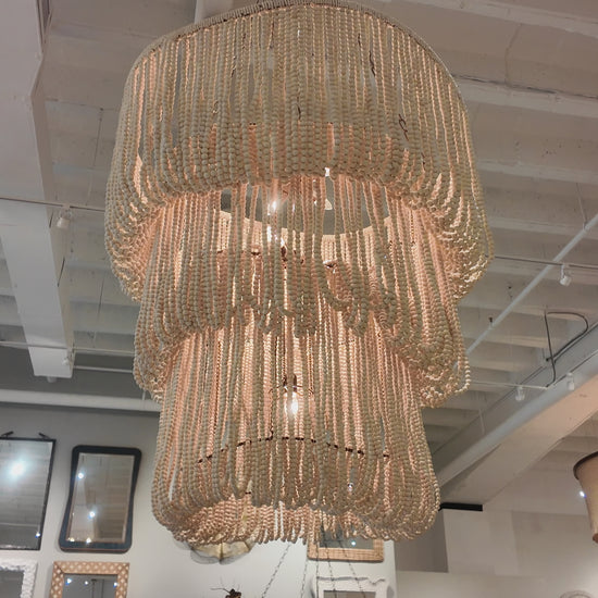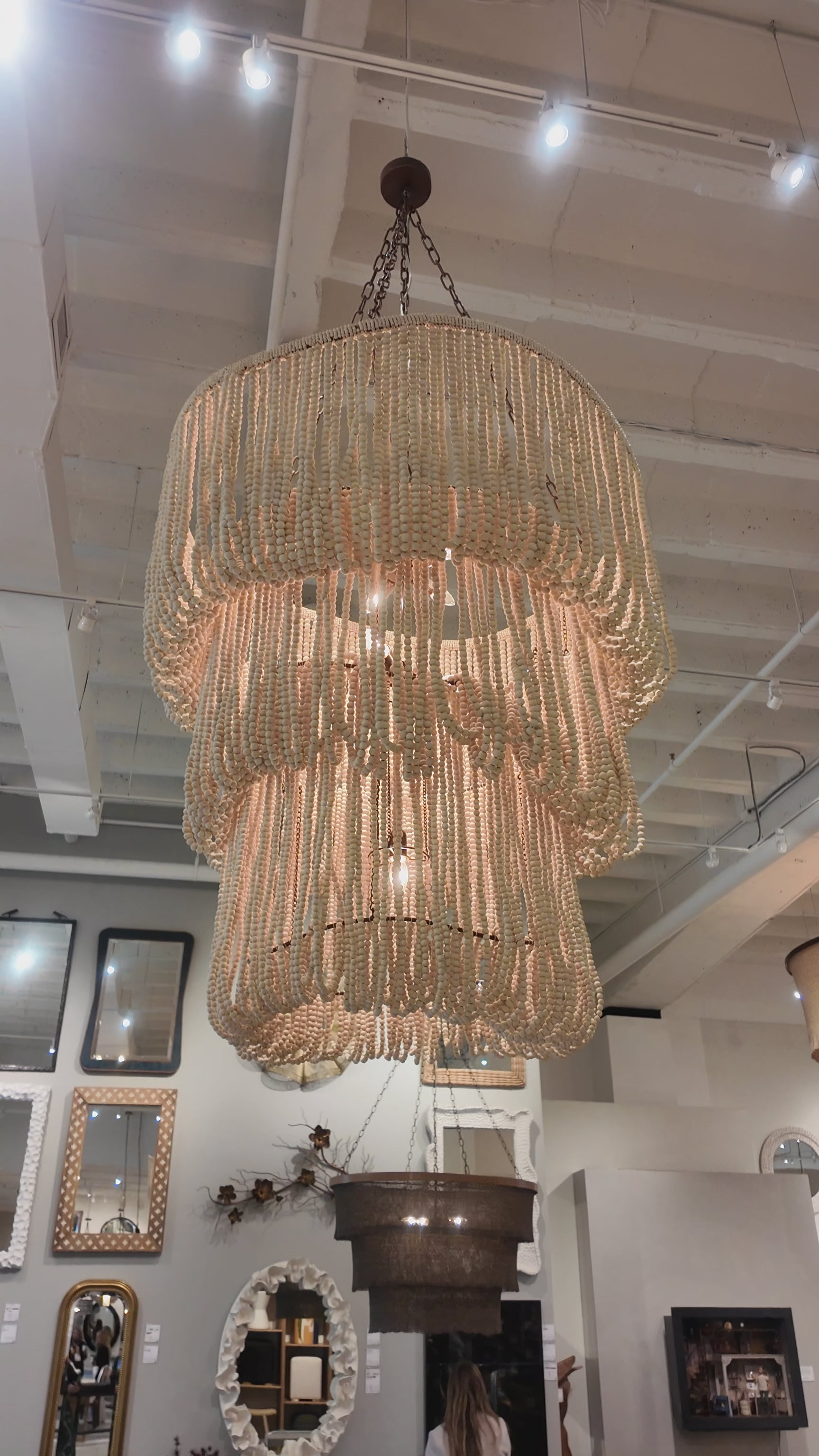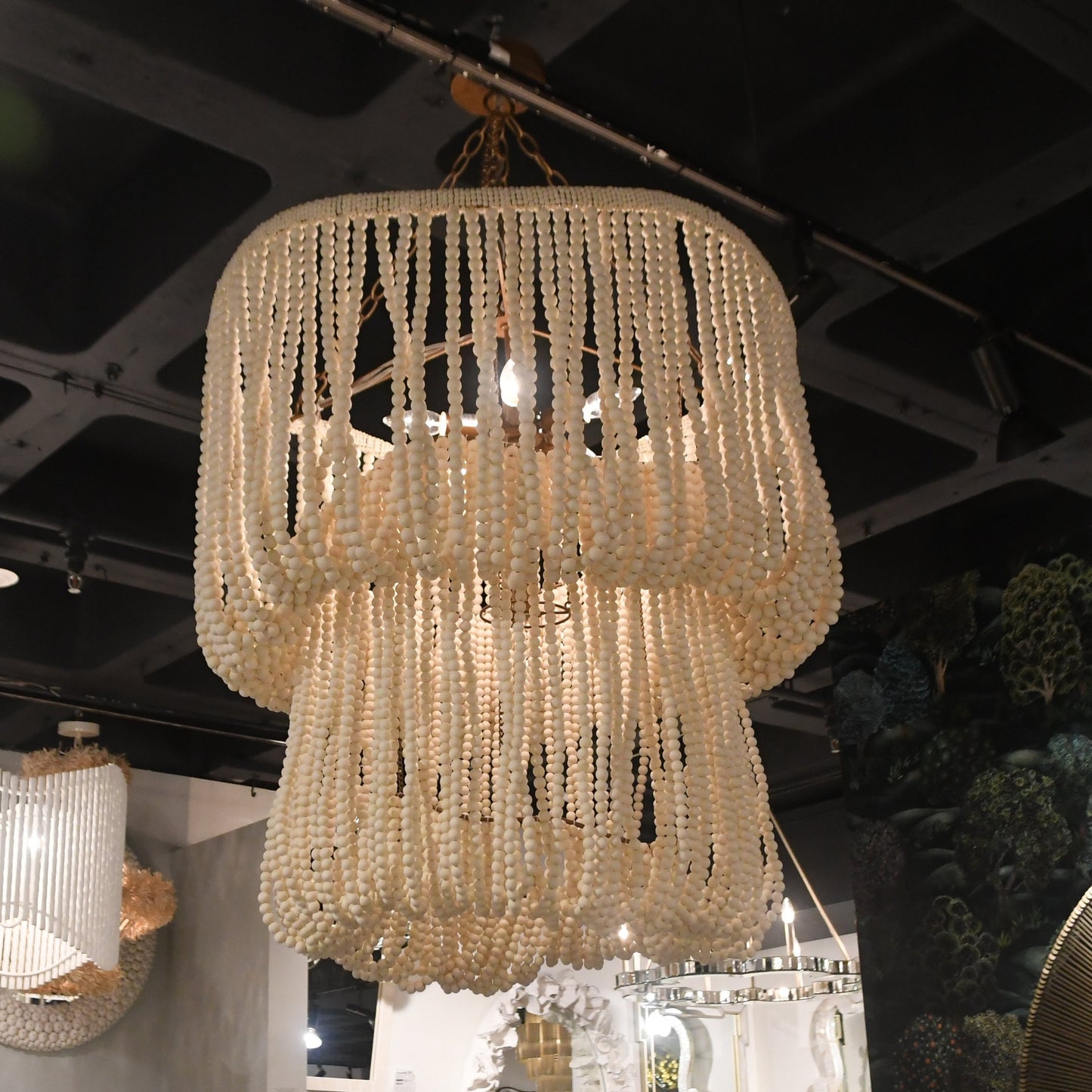 The Belva Chandelier in White Coco Beads from Made Goods is draped with multiple tiers of hand-strung coco beads, perfect for creating a dramatic effect in your space. Capturing contemporary design for your home, large chandeliers like the Belva reflect a casual yet chic vibe.
