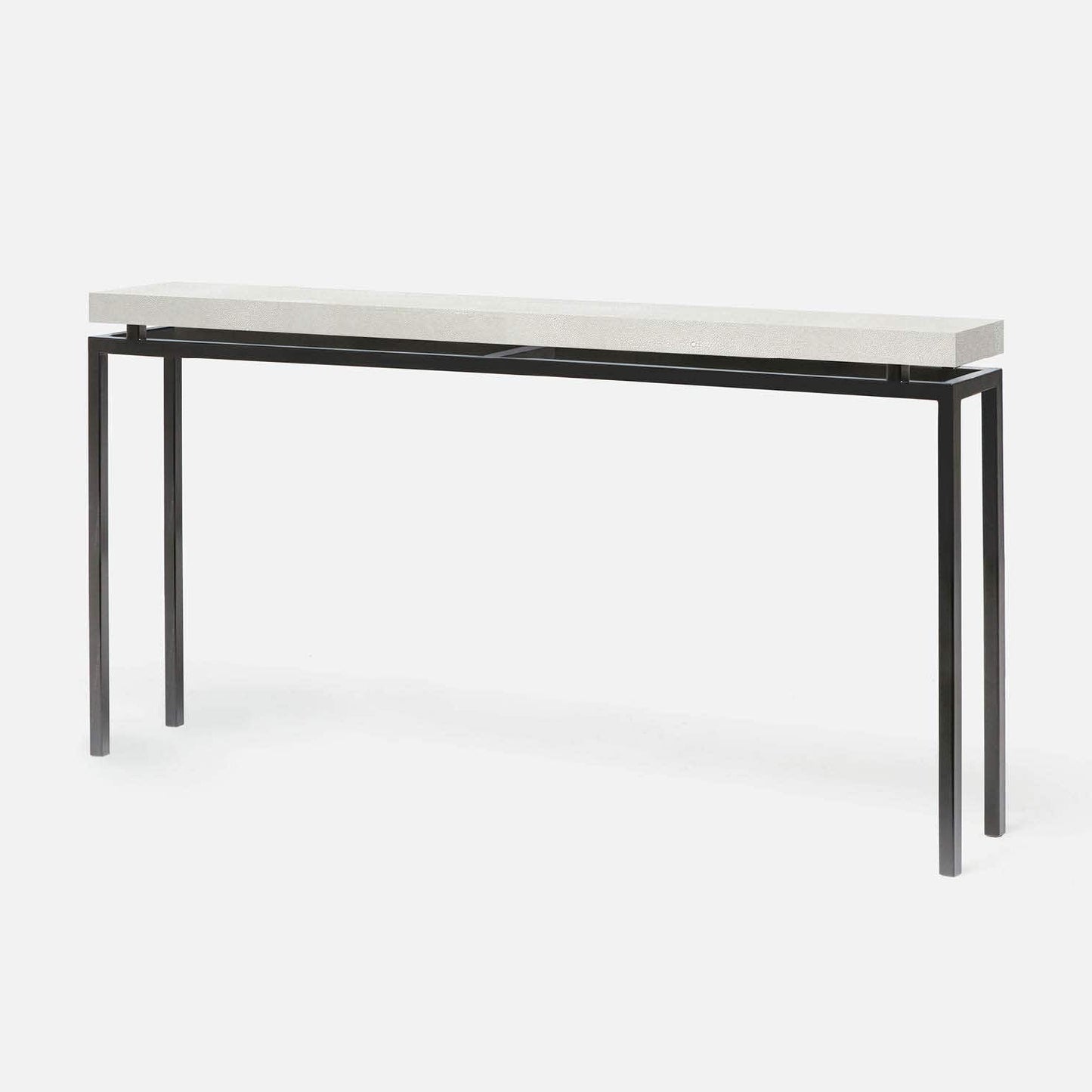 The Made Goods Benjamin Console Table in Flat Black with Ivory Faux Shagreen is a fabulous custom piece of furniture. The Benjamin design is simple and modern with its straight legs, yet the overall look is that of high-end console tables.
