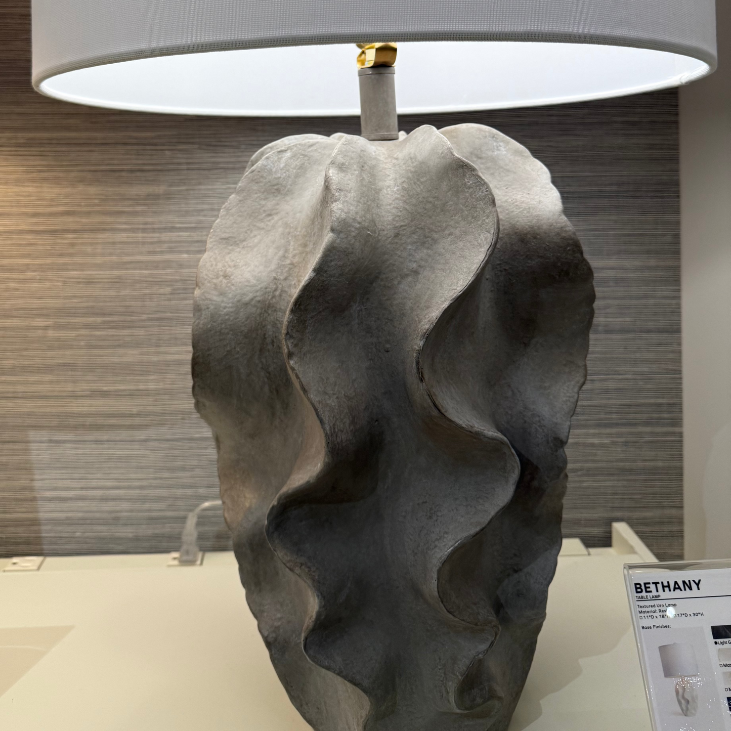 Crafted by Made Goods, the Bethany Lamp in Light Gray Resin boasts a beautifully curved base made from intricately textured white resin. The elegant urn shape is complemented by a linen shade, creating a sophisticated yet modern look.