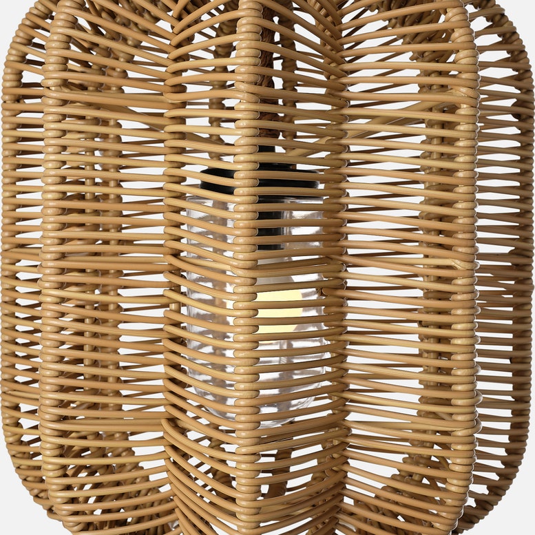 The Bevan Pendant in Light Honey Rattan by Made Goods showcases graceful curves crafted from durable, refined faux rattan. This pendant light is an excellent choice to enhance the ambiance of diverse outdoor settings.