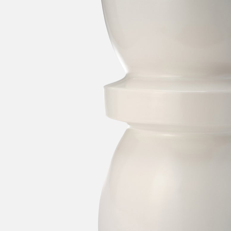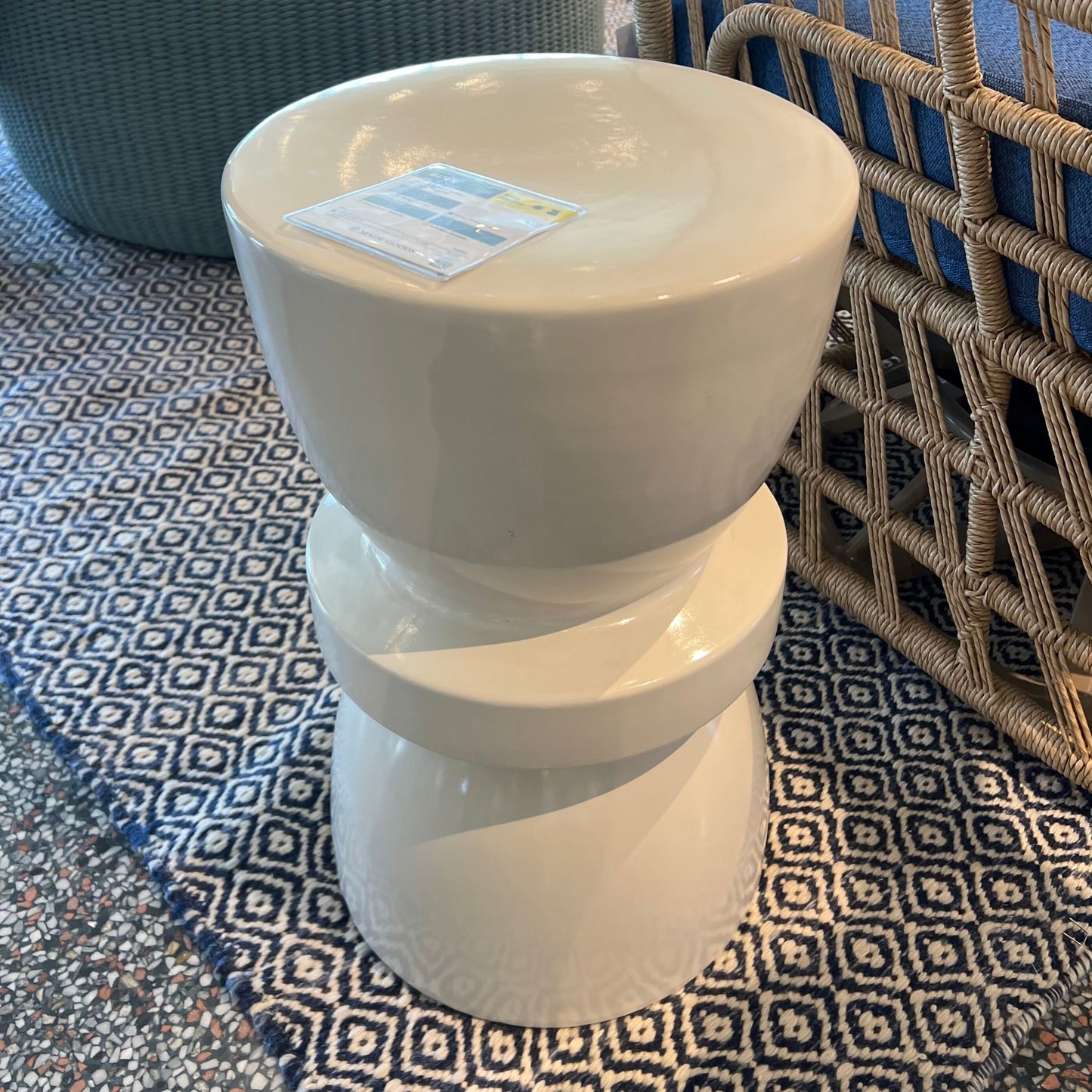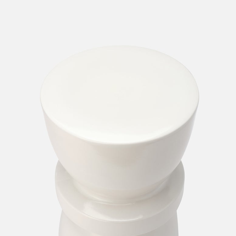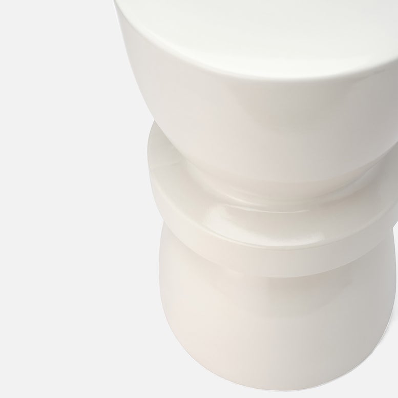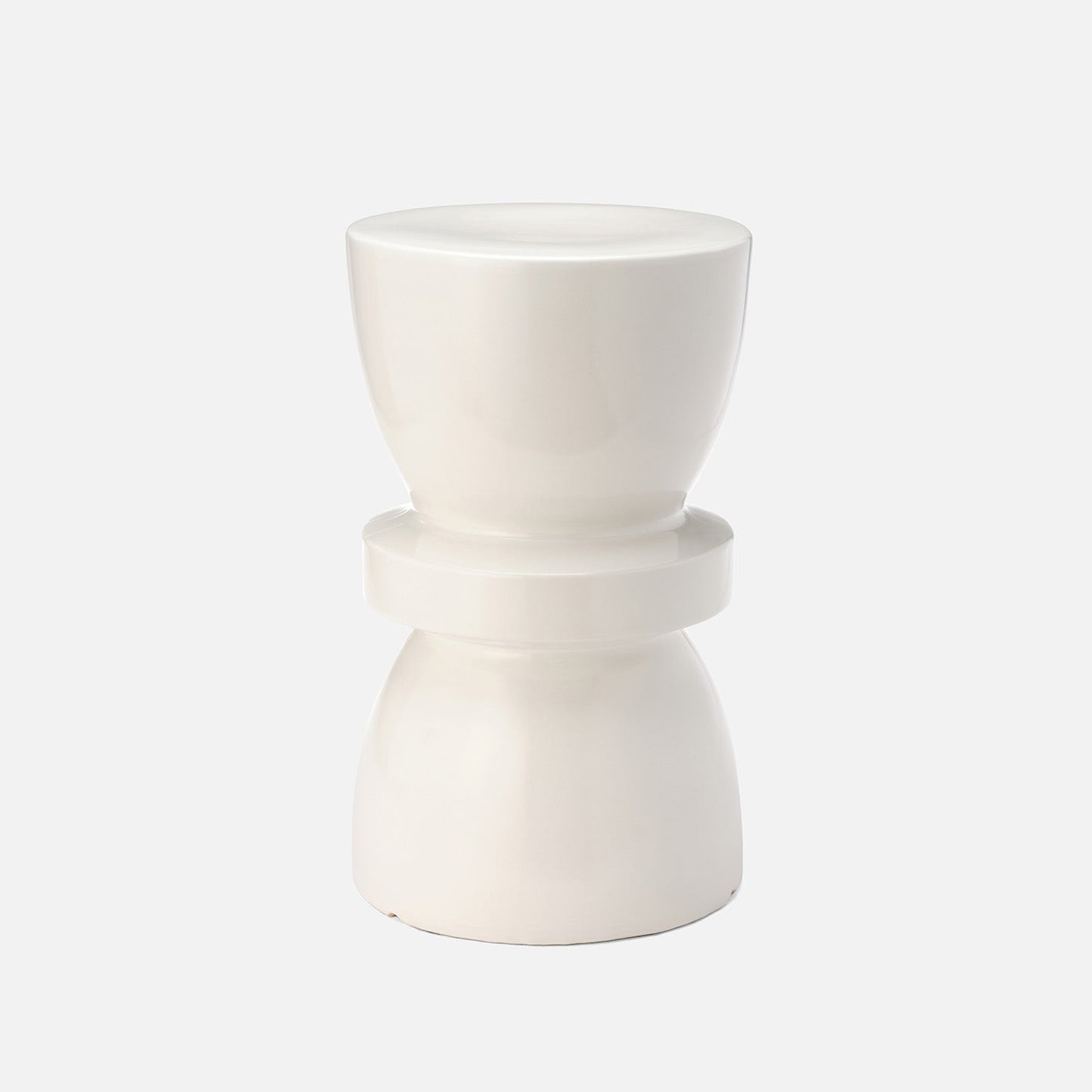 The Binx Stool in Glossy White Ceramic from Made Goods, boasts a modern hourglass design suitable for both indoor and outdoor use. This handcrafted stool is not only functional, but also adds a touch of style to your space.