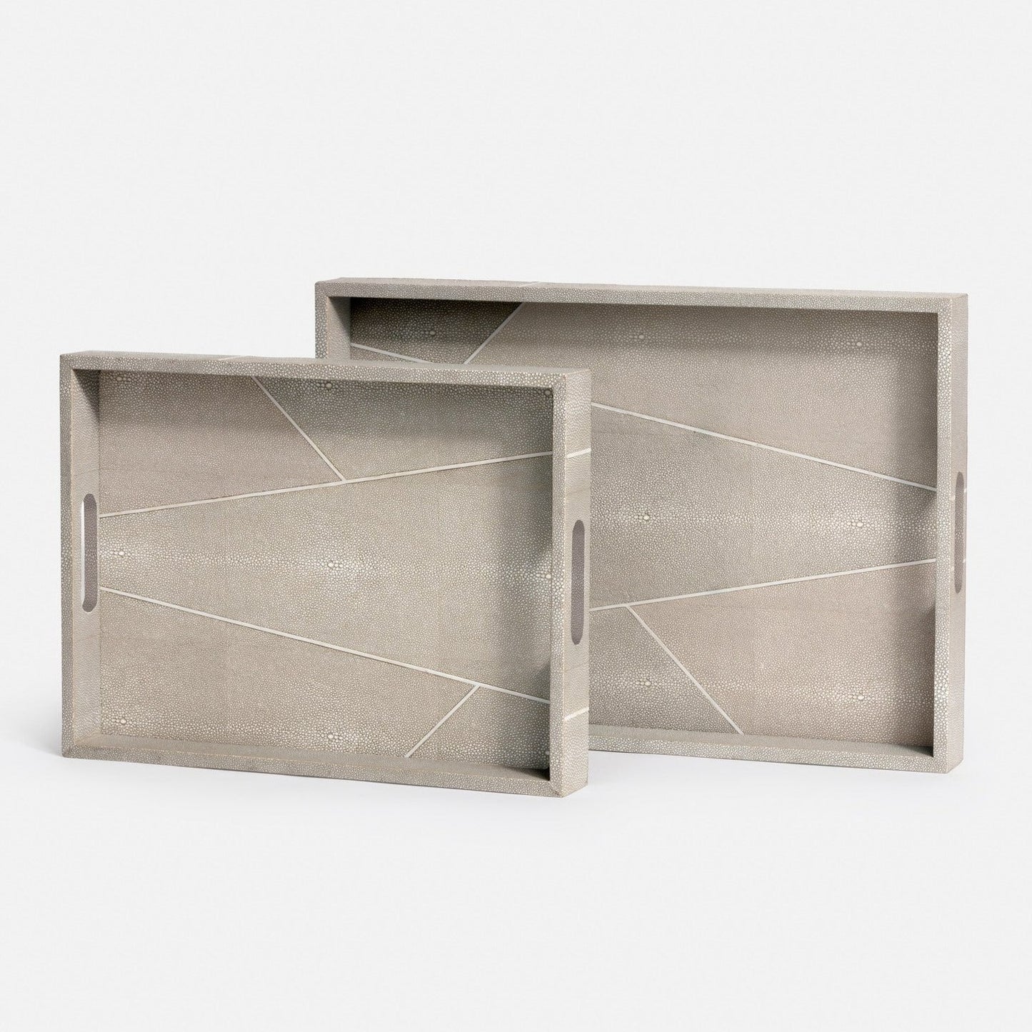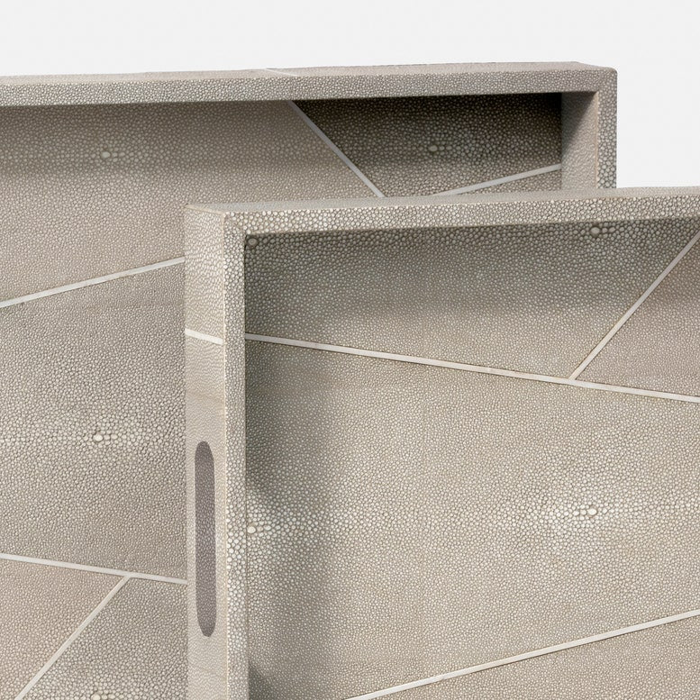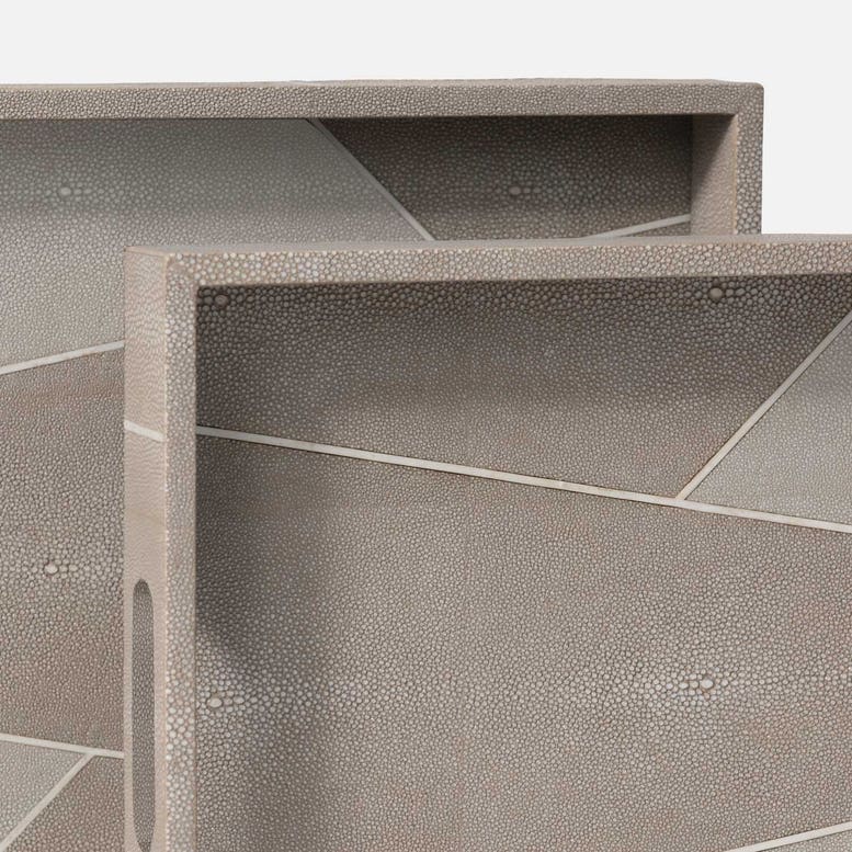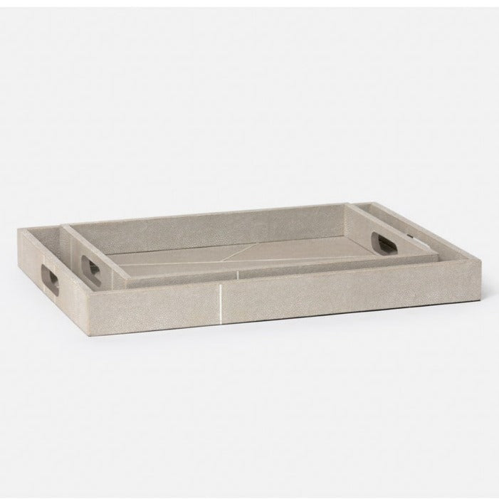 The Breck Tray Set in Sand Faux Shagreen from Made Goods was inspired by classic Art Deco design. Made of faux shagreen with a faux bone trim these trays showcase attention to detail and thoughtful proportions create a statement making tray set.
