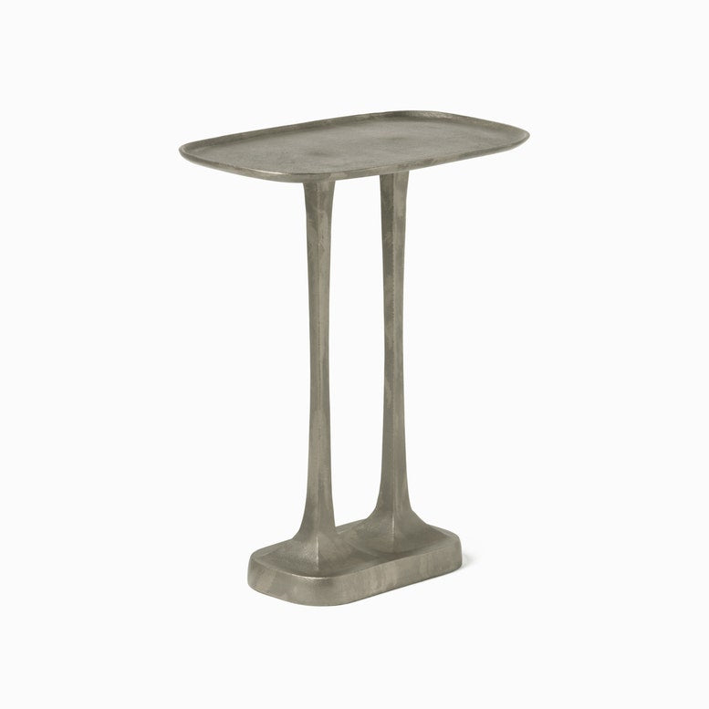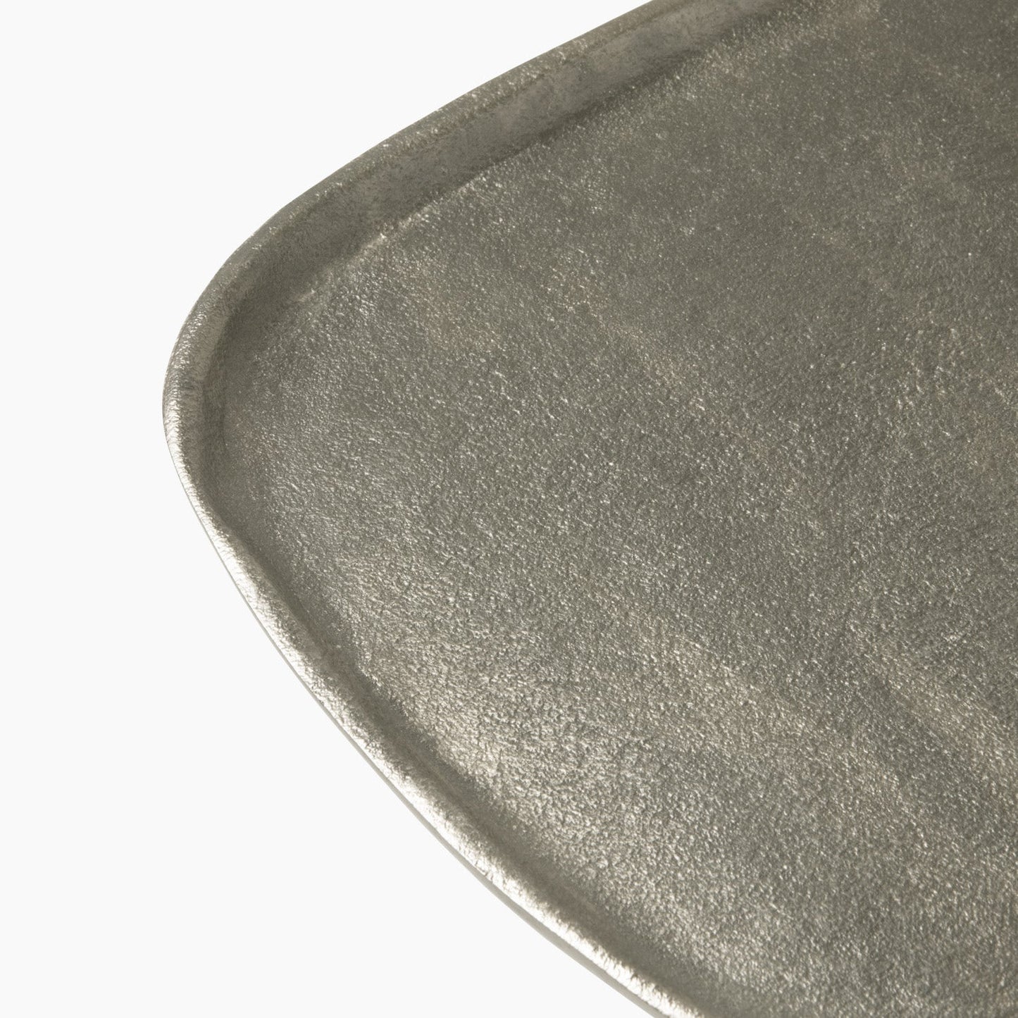 The Brenna Accent Table in Antiqued Silver Textured Metal from Made Goods features the striation of antiqued silver textured metal with an intentionally uneven edge on its tray top and legs inspired by nature.