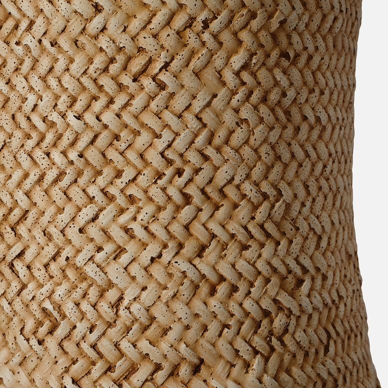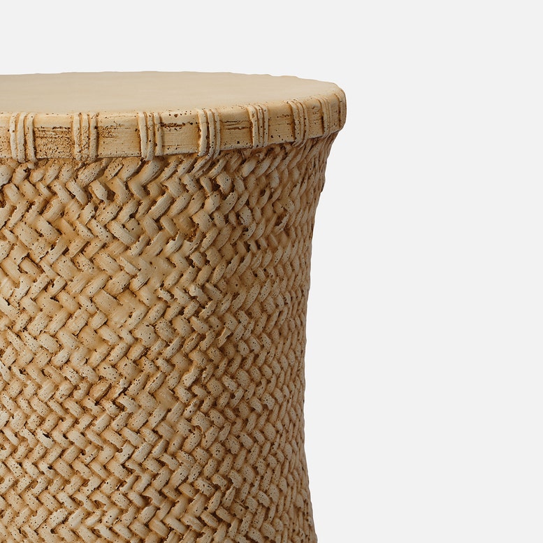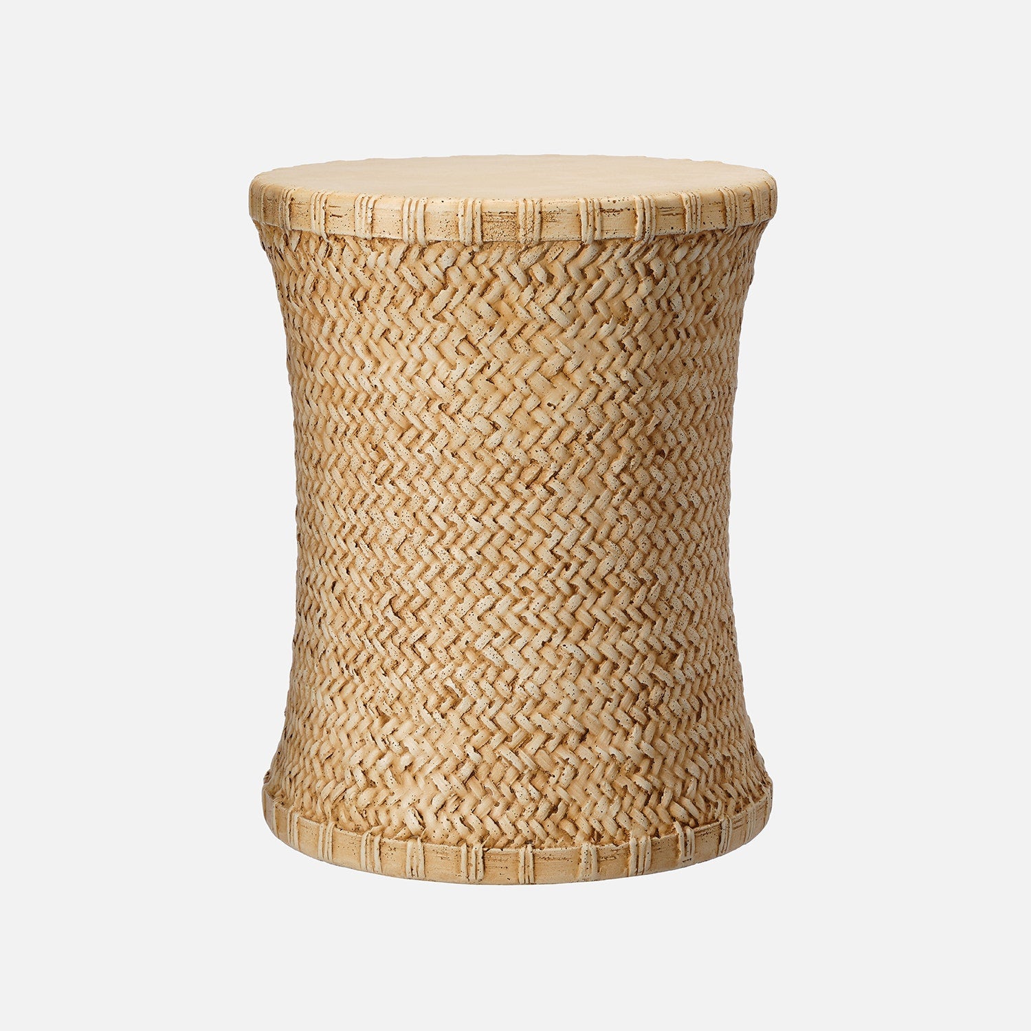 Bridgetta Stool in Golden Wheat by Made Goods is crafted from durable stonecast, featuring an intricate basket weave pattern on its base. Its subtle curved shape adds a touch of elegance.