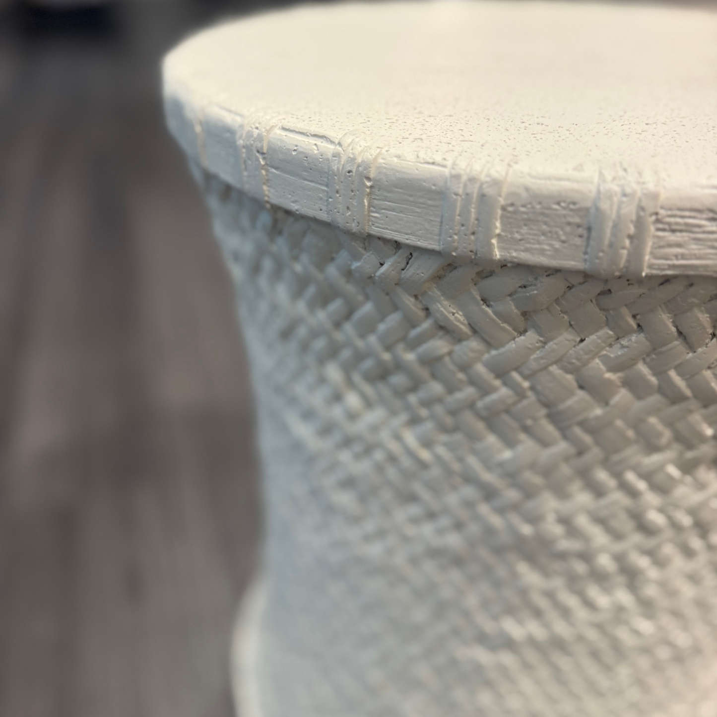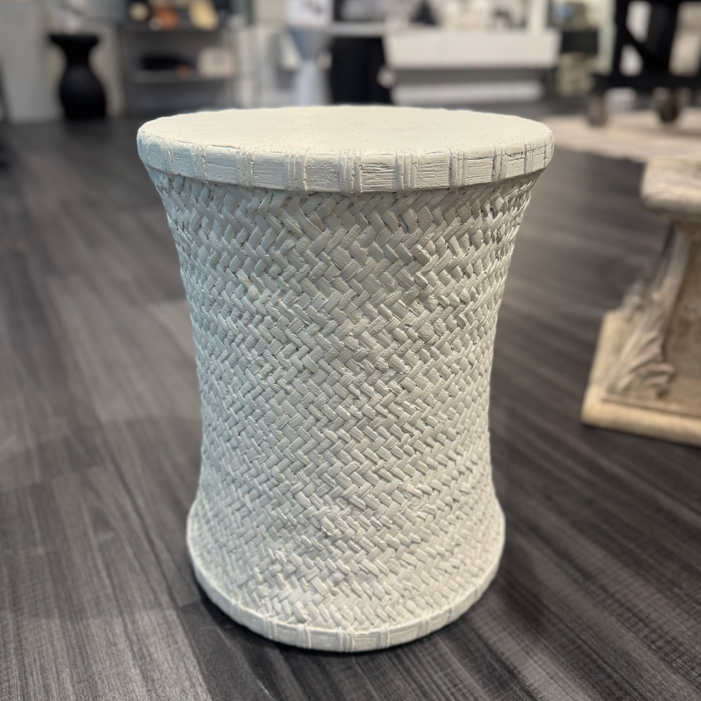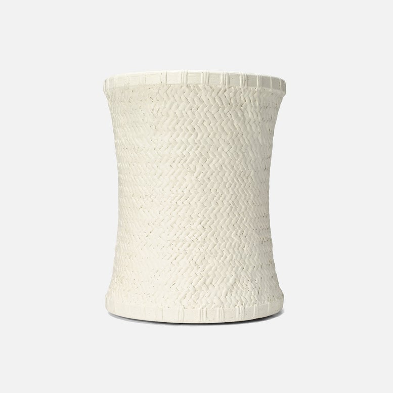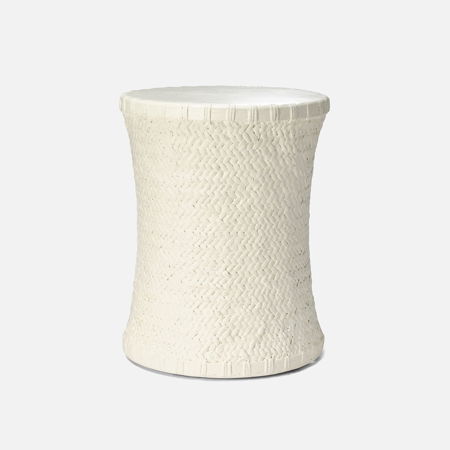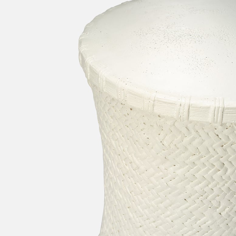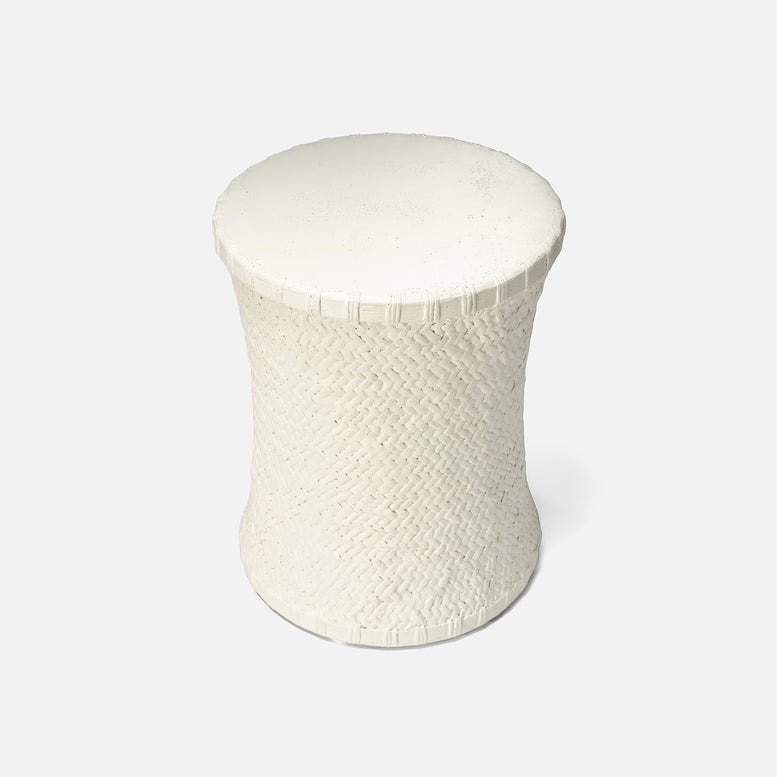 Bridgetta Stool in Off White by Made Goods is crafted from durable stonecast, featuring an intricate basket weave pattern on its base. Its subtle curved shape adds a touch of elegance.