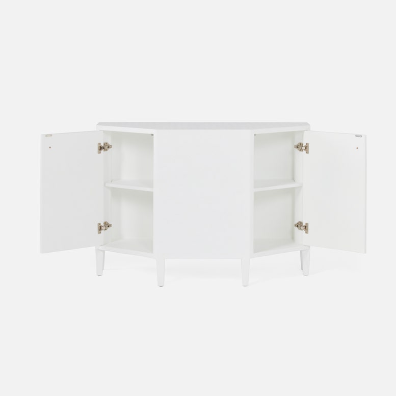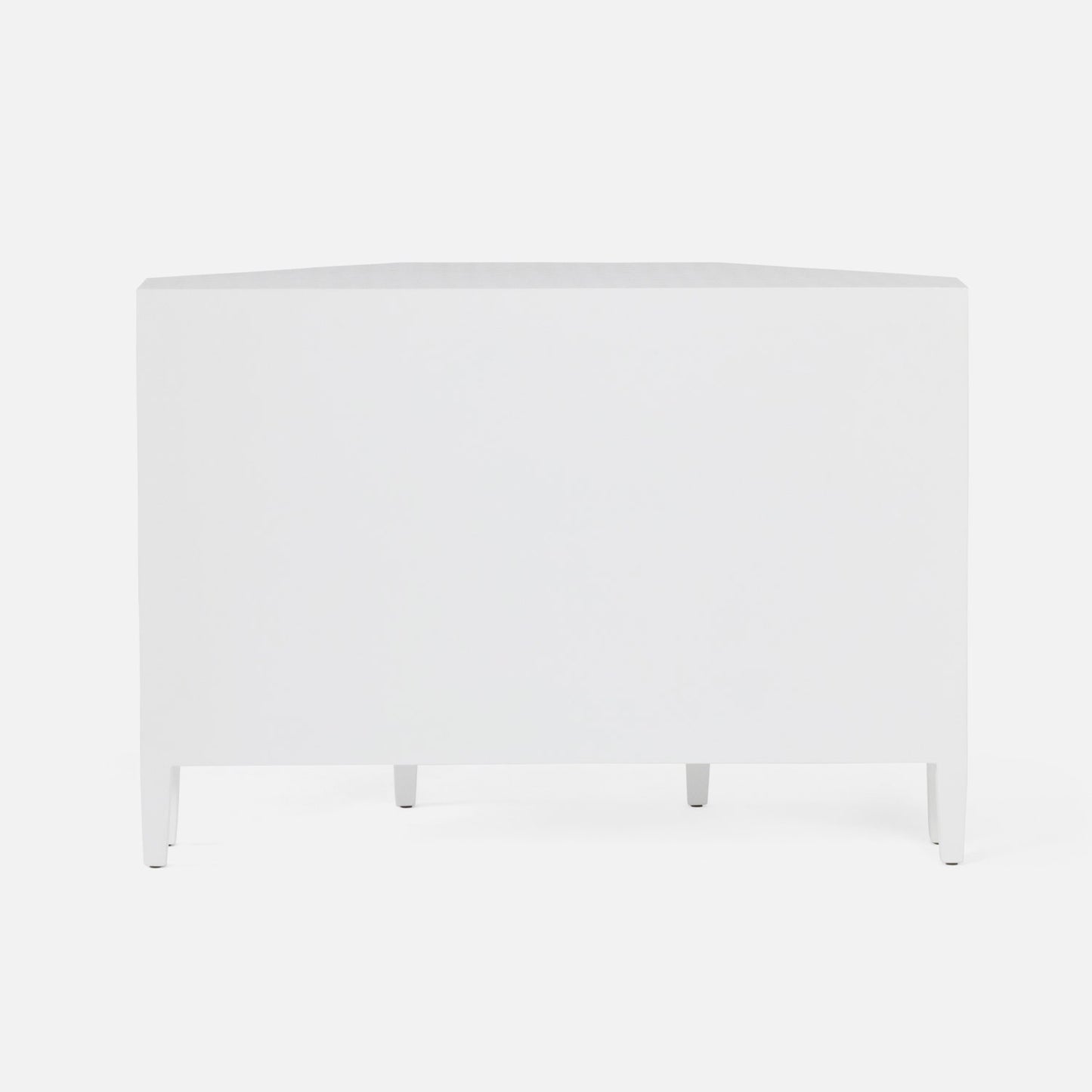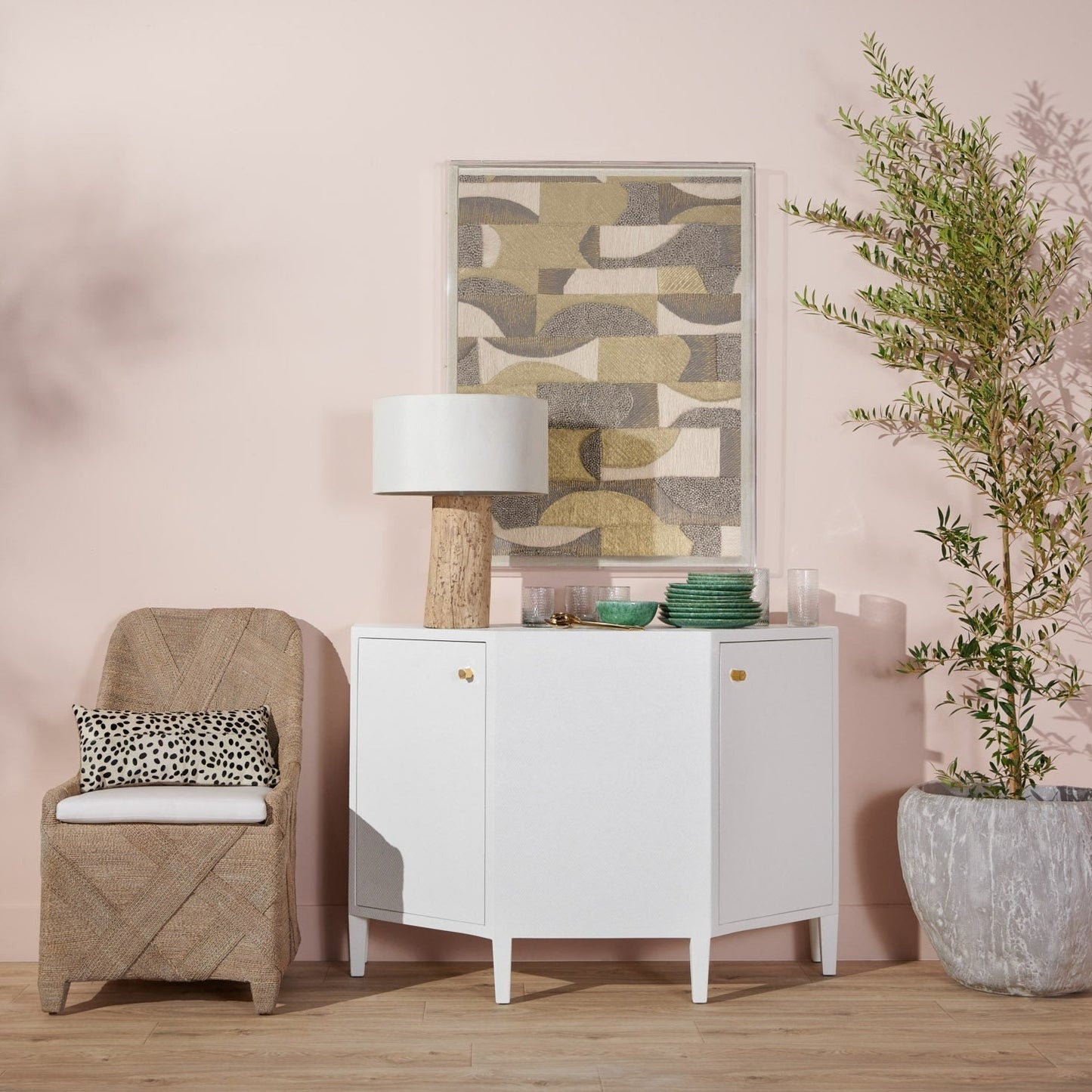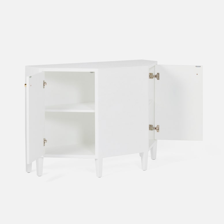 The faceted Bromley Buffet in Designer White Basket Faux Rattan Weave from Made Goods is sleek and angular, softened by a textural flat-weave faux rattan finish. A brass knob accents a door on each side that conceals two deep shelves that run from end to end.