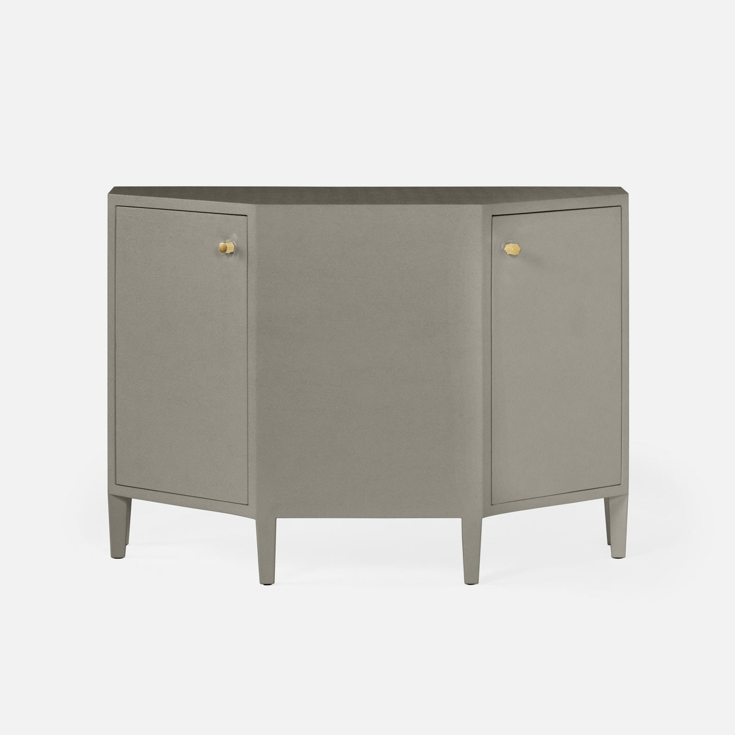 The faceted Bromley Buffet in Light Gray Basket Faux Rattan Weave from Made Goods is sleek and angular, softened by a textural flat-weave faux rattan finish. A brass knob accents a door on each side that conceals two deep shelves that run from end to end.
