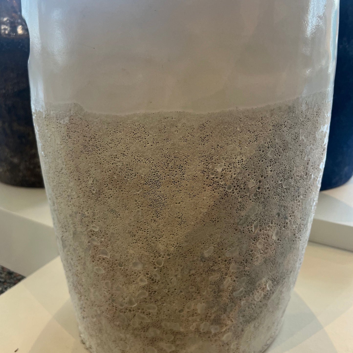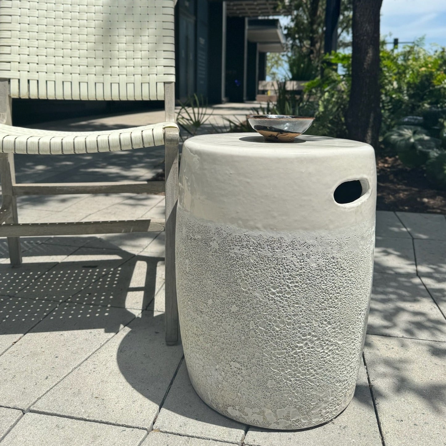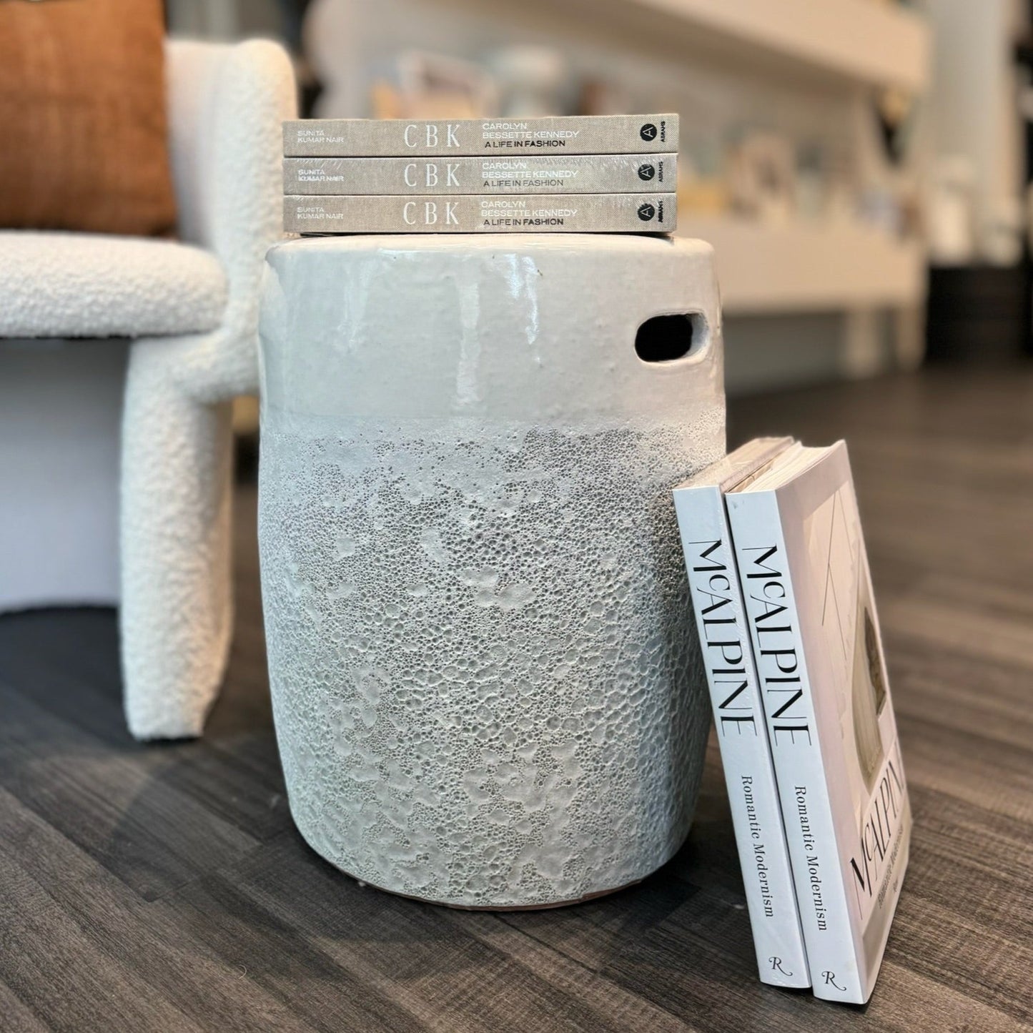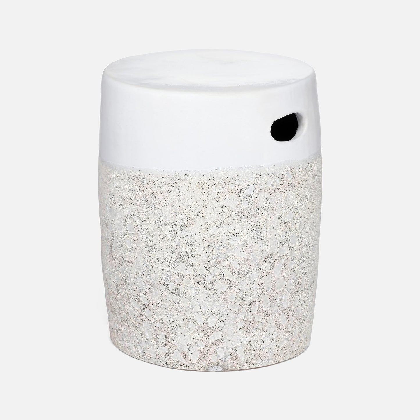 Crafted from ironstone using a reactive technique, the Cadence Stool in White from Made Goods boasts an intriguing two-toned appearance. The heavily textured bottom portion perfectly contrasts with the semi-gloss top, creating a unique and stylish piece.