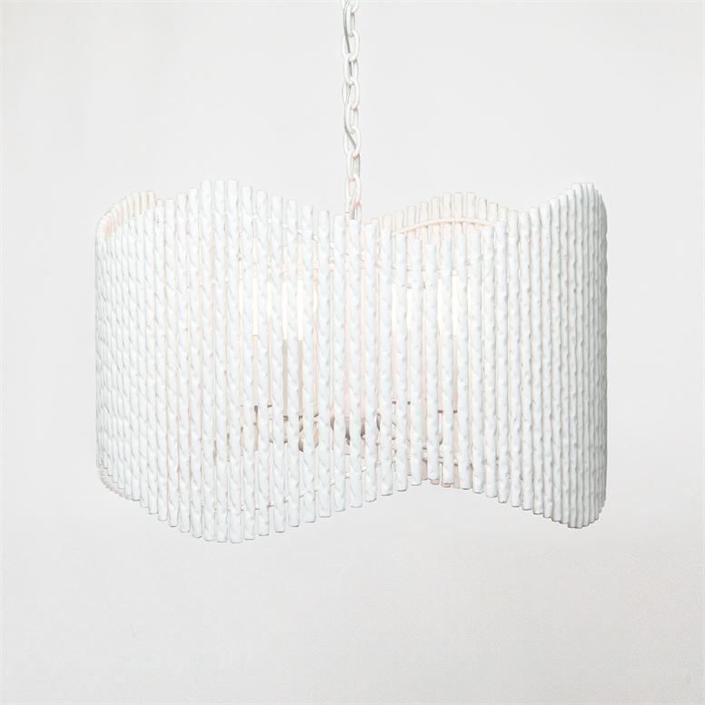 A modern shape with a beachy vibe, the Camille Chandelier in White Gesso Metal from Made Goods is a piece that catches the eye without taking over a room. The twisted plaster bars are wonderfully detailed, alternating dimensions with the flow of the chandelier.