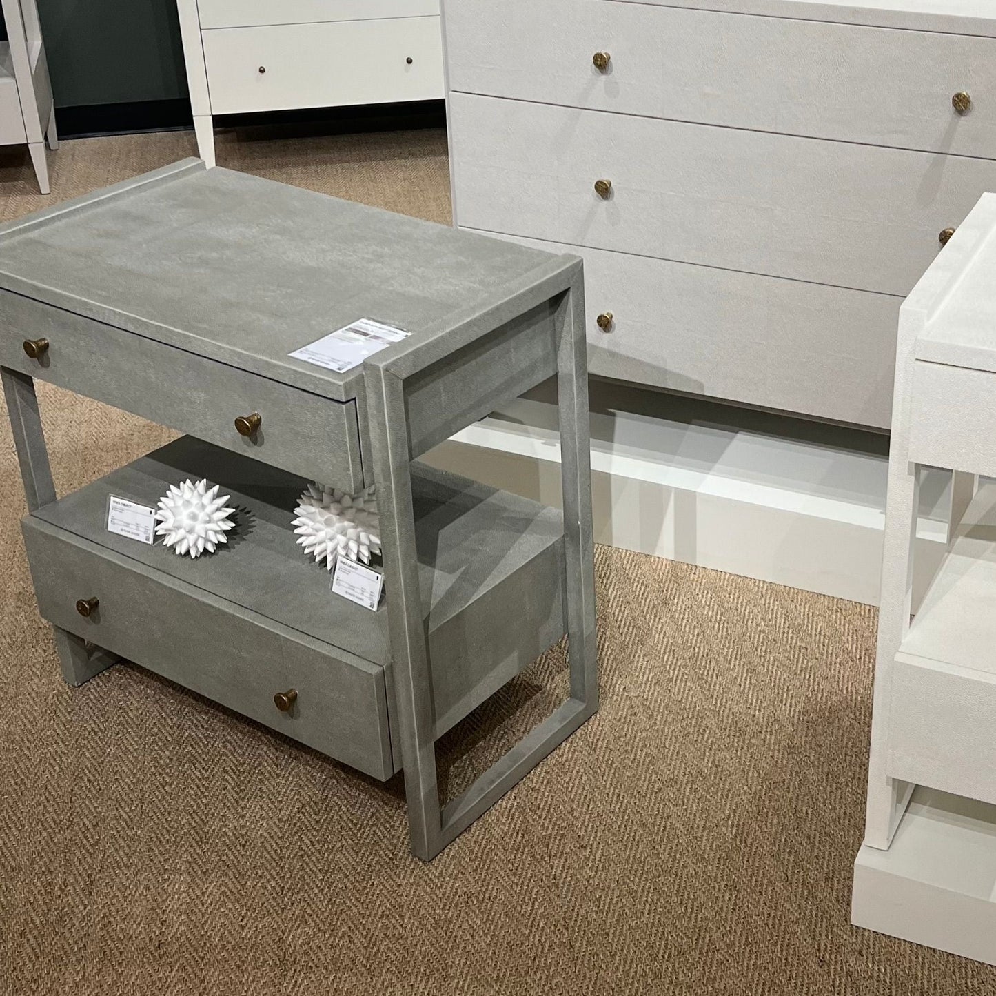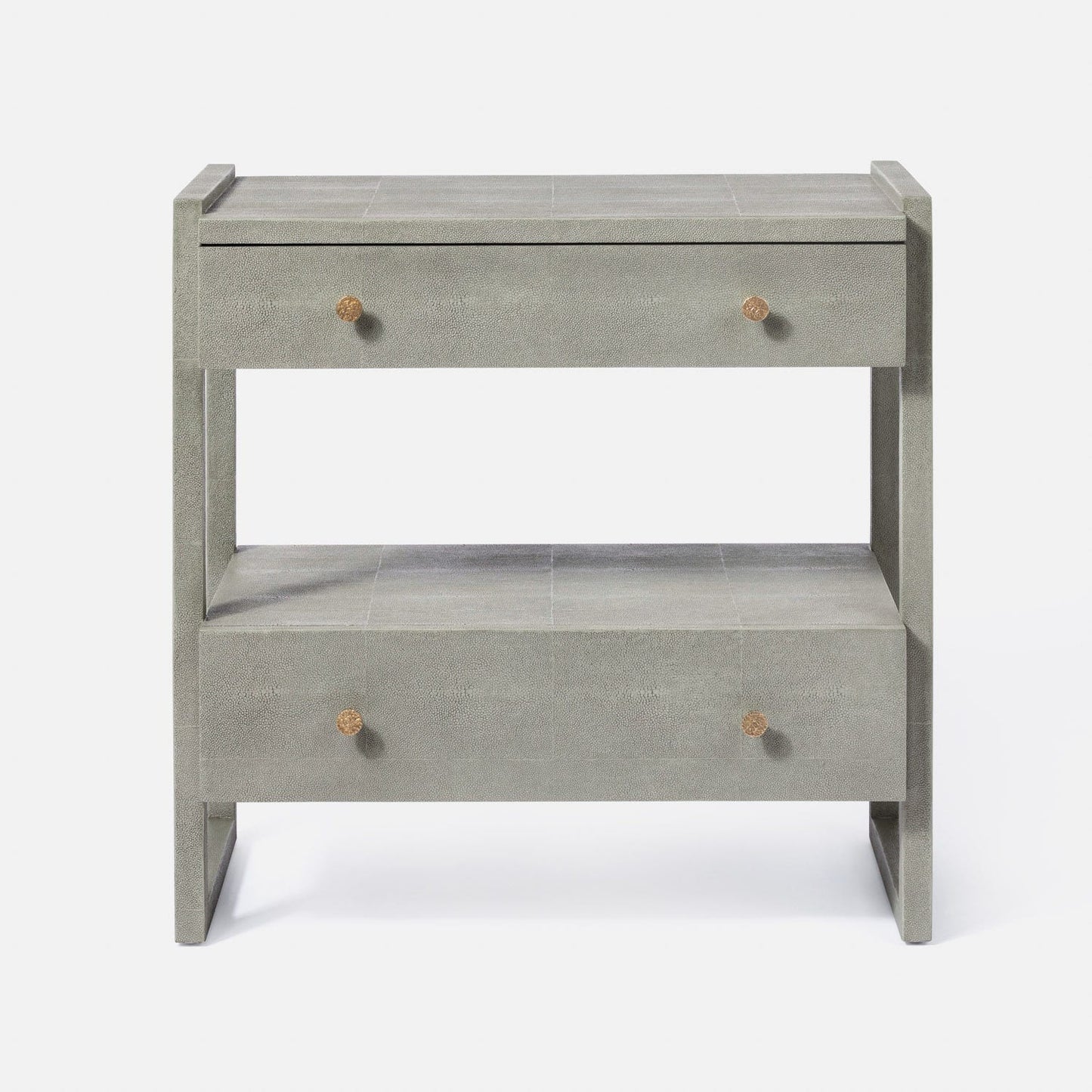 Capture clean shapes and sophisticated functionality for your space with the Carrigan Double Nightstand in Castor Gray Vintage Faux Shagreen from Made Goods. With a geometric frame and two off-set drawers, each linear piece is meant to be seen from all angles. The neutral hue complements the minimalist vibe of this elevated side table.