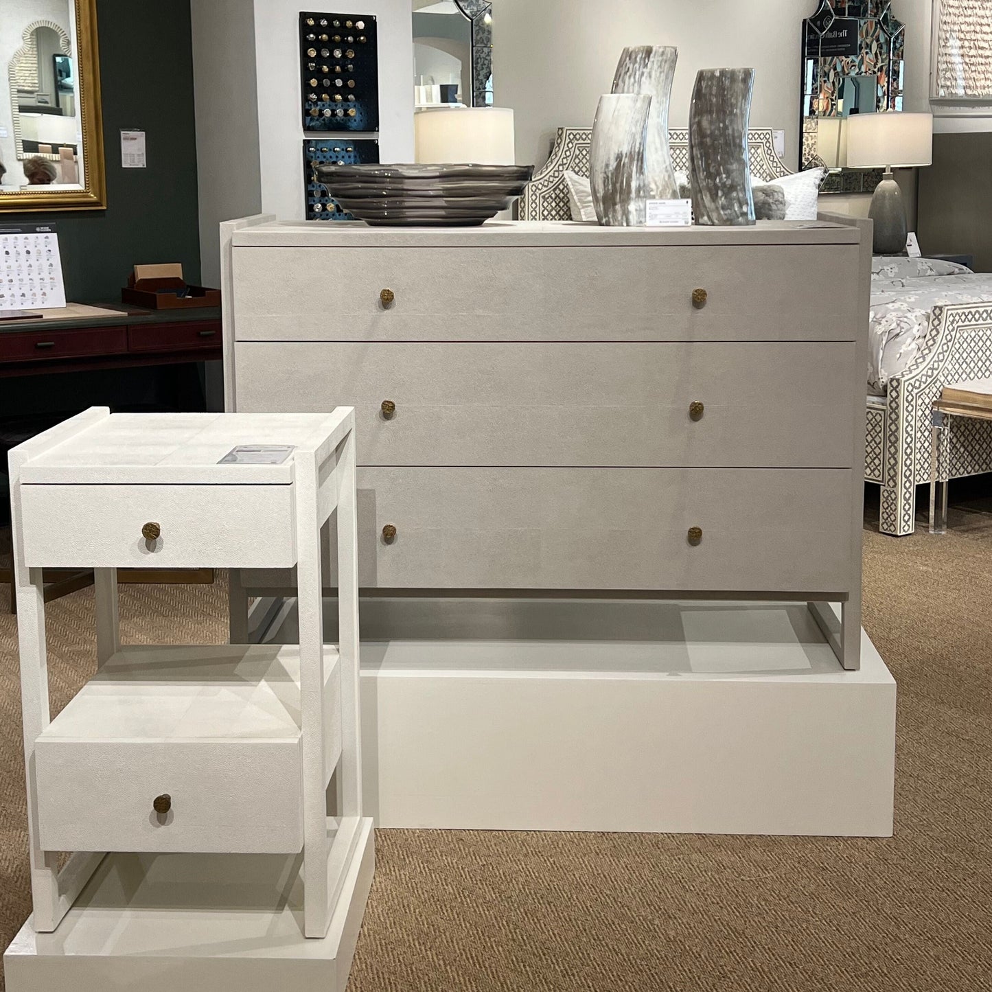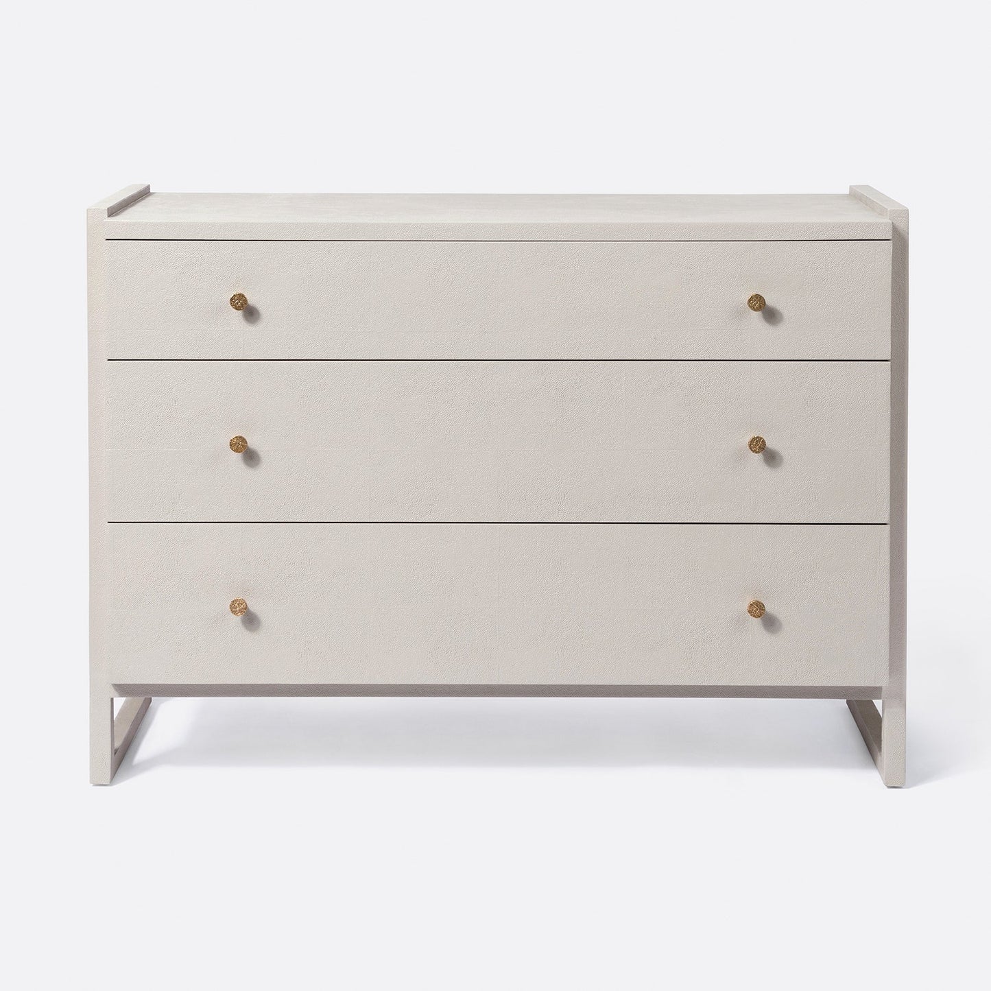 Enhance your space with the 48" Carrigan Dresser in French Grey Vintage Faux Shagreen from Made Goods. The geometric frame and unique drawers create a visual appeal. Its neutral vintage faux shagreen complements any minimalist aesthetic.
