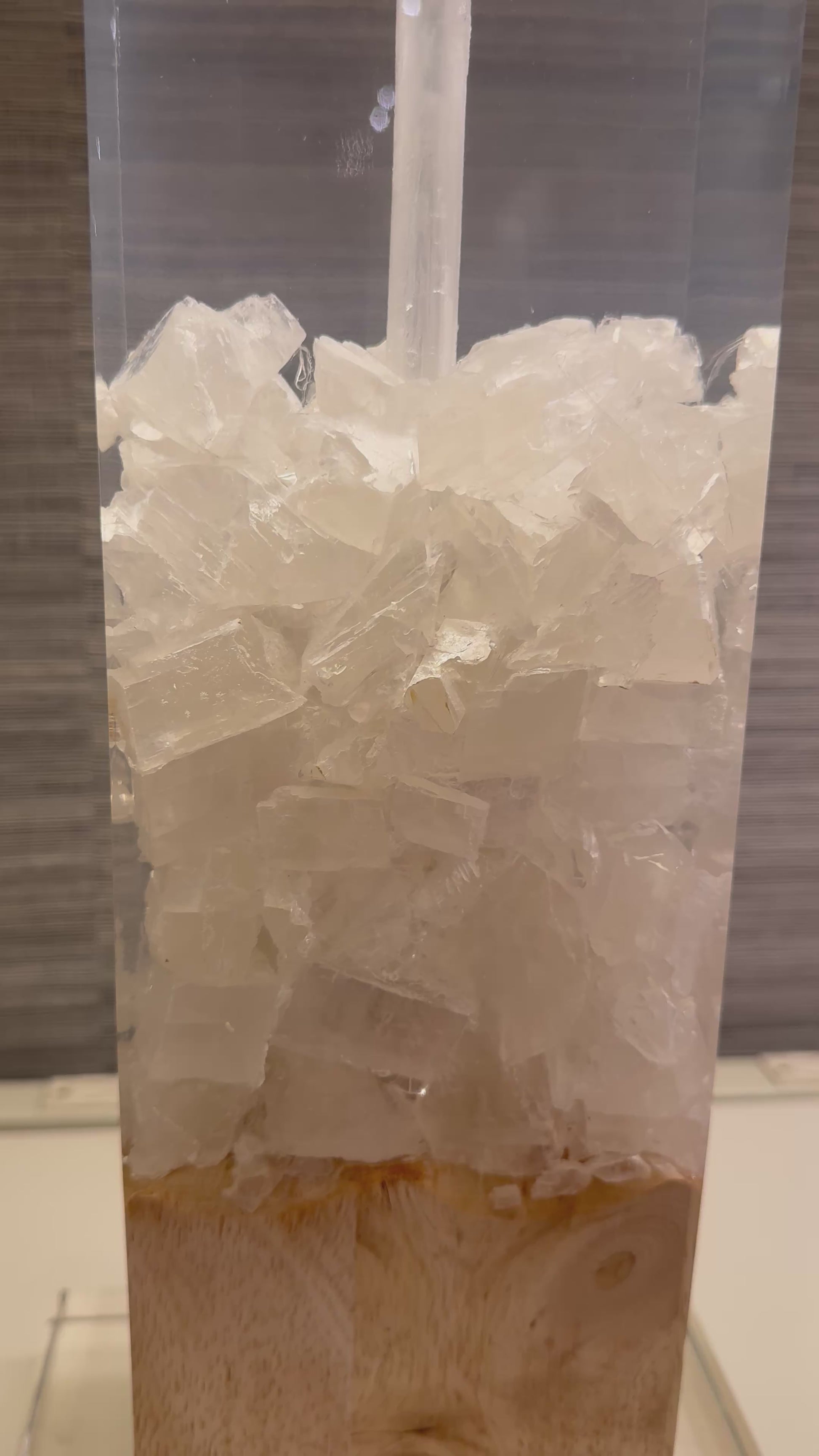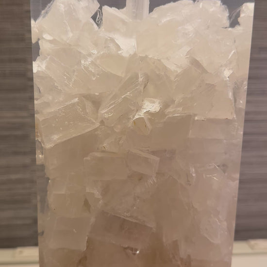 Wood grain patterns shift subtly across the surface, each lamp carrying its own map of growth rings and natural variation. This is not uniformity but authenticity. Quartz elements introduce a mineral quality, cool and precise against the organic warmth of the wood. Together they create a visual rhythm that feels both modern and rooted. The proportions matter. The lamp sits at a scale that belongs on a side table or console without overwhelming the surface it occupies.