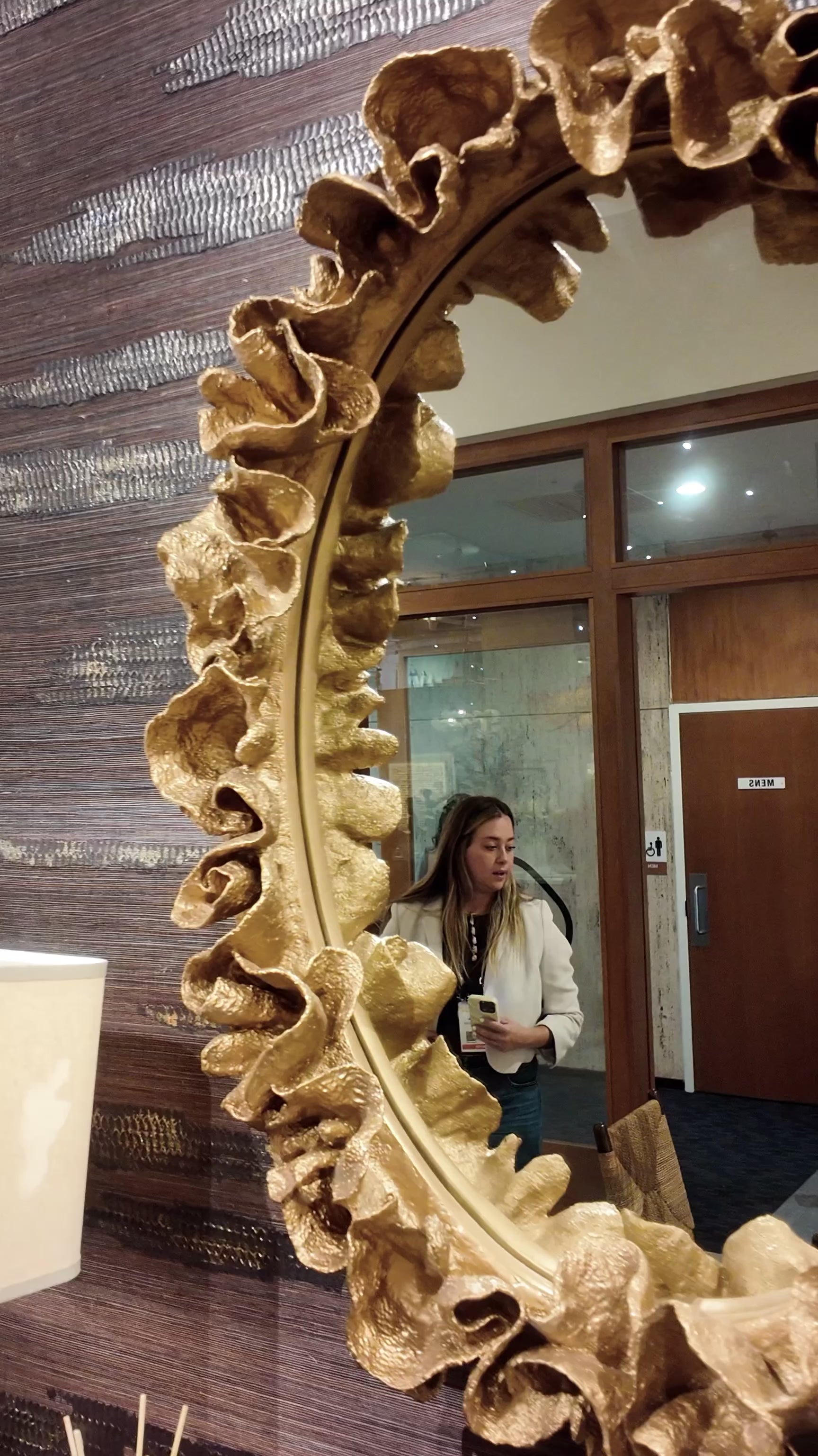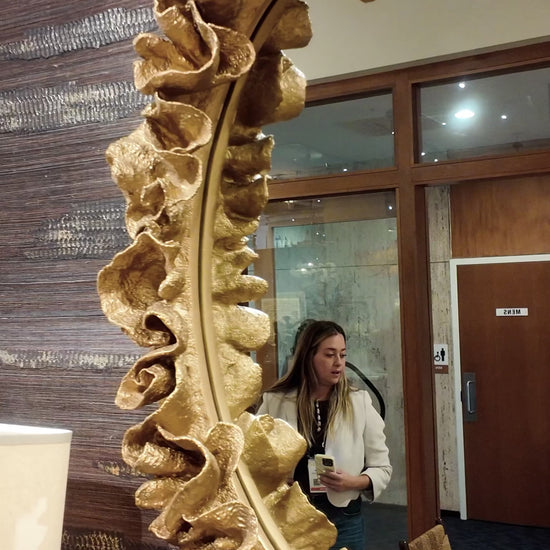 The Coco Mirror in Gold Faux Coral by Made Goods features hours of molding and hand painting are necessary to fashion the Coco's undulating oval of white coral. For a less casual interpretation, a thin silver or gold tip is applied to the end of each ''leaf.'' This mirror has a ruffled frame with an approximate 6” depth.