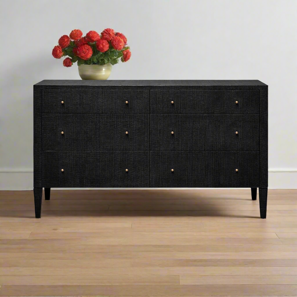 60" Conrad Dresser in Black Faux Raffia by Made Goods features a modern faux raffia finish with gold knobs and tapered legs. With four drawers and lined interiors, it combines functionality with style. Perfect for any space.
