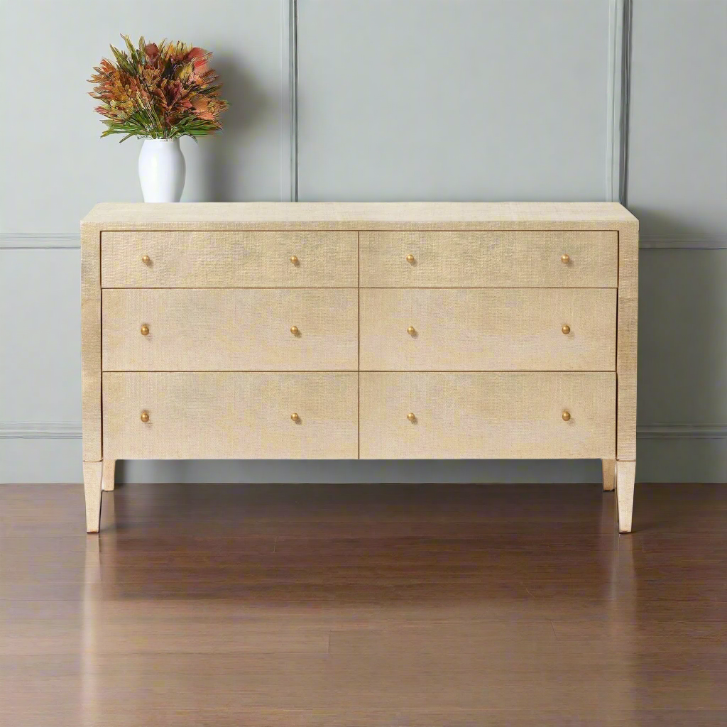 Champagne Faux Raffia Finish; 6 Drawers; Brass Drawer Pulls