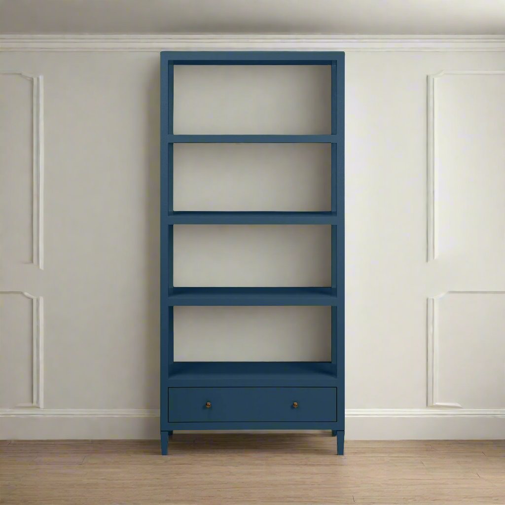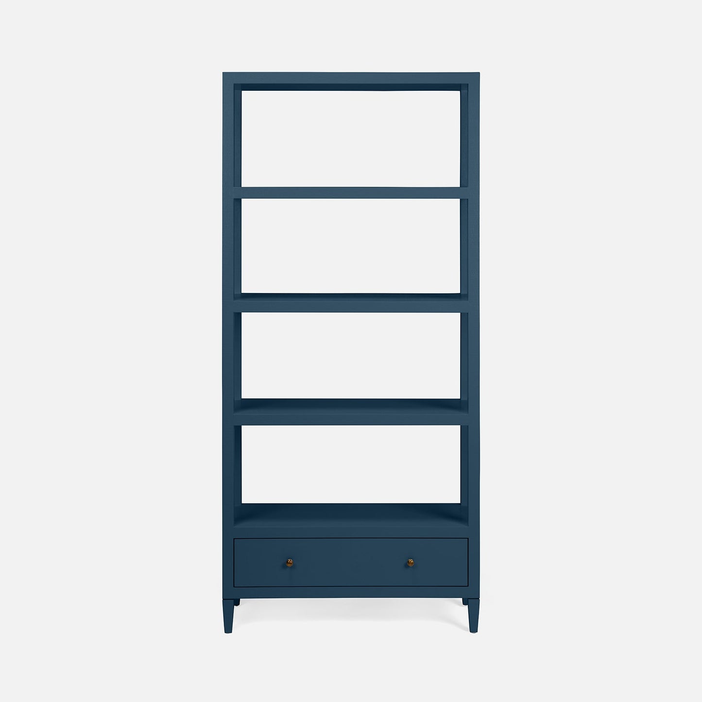 The Conrad Bookcase in Vintage Navy Faux Raffia from Made Goods features expertly crafted cabinetry and meticulous attention to detail. With proportions that are both modern and refined, each Conrad Bookcase lends quiet grandeur to any space.