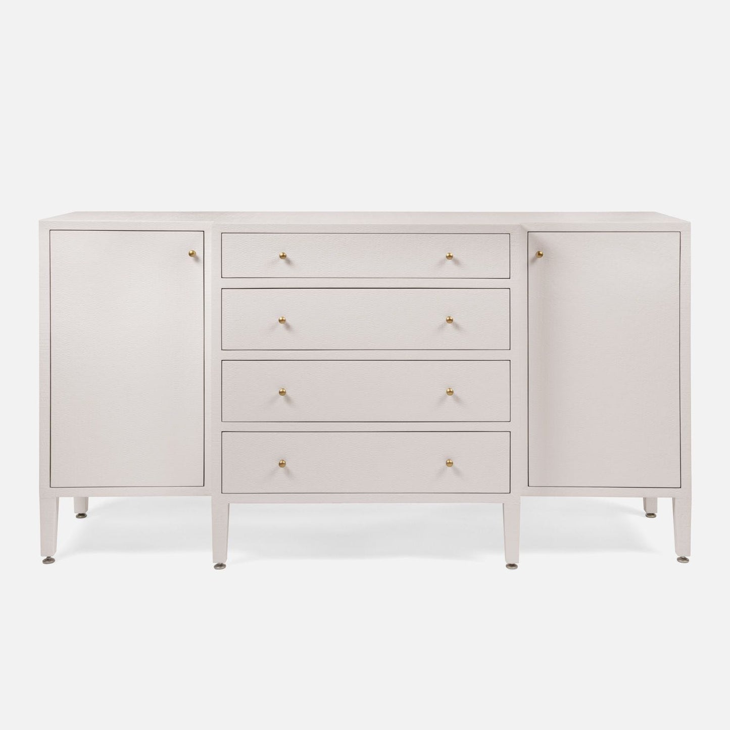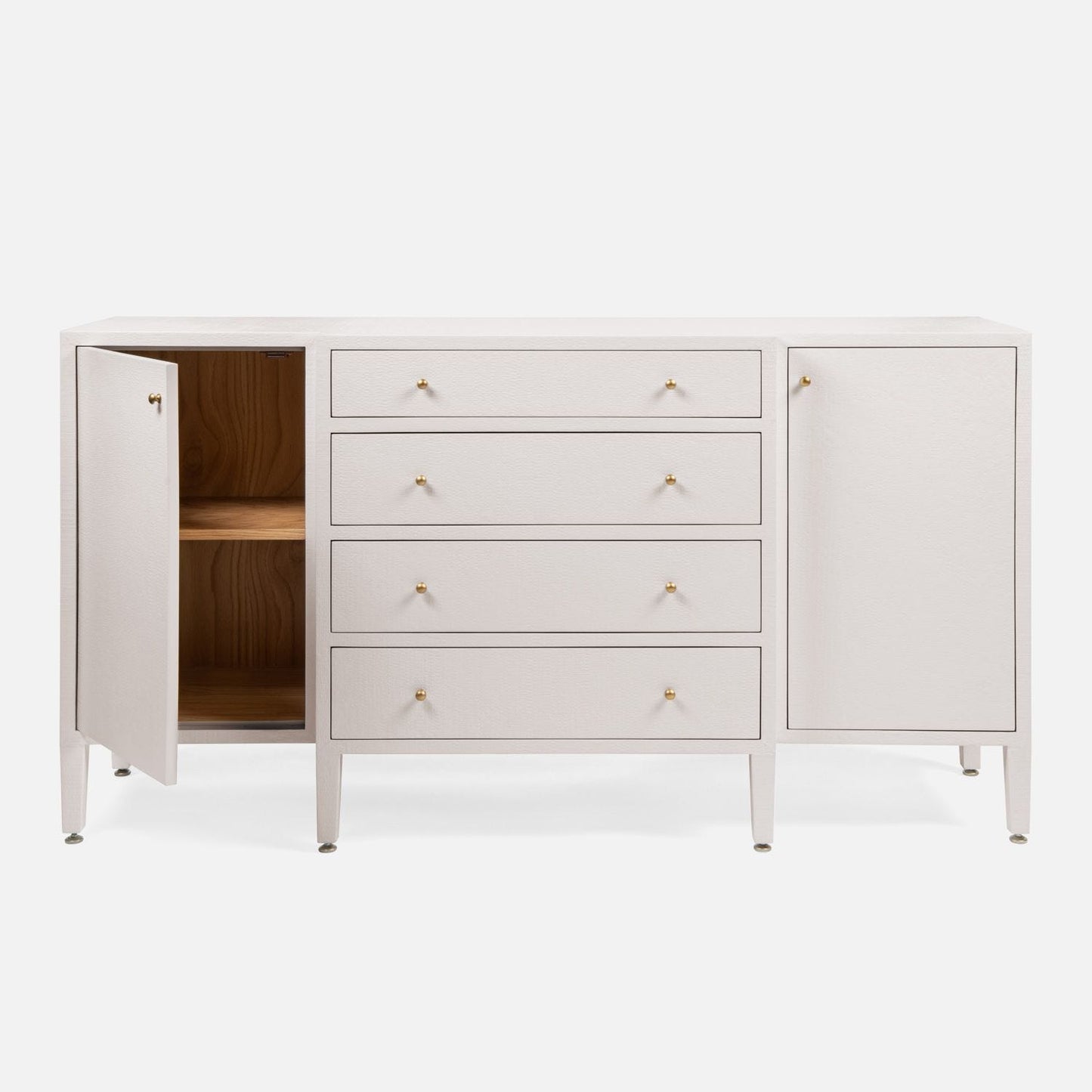 The Conrad Deep Drawer Buffet in French Gray Faux Raffia from Made Goods is both long and dimensional. Combining design with functionality, the Conrad Buffet is the perfect addition to any space!