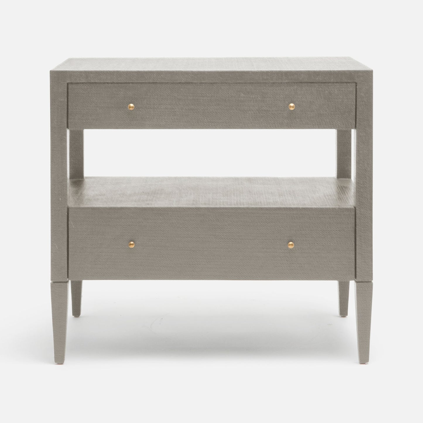 Made Goods Conrad Double Nightstand in Seal showcases a faux raffia texture with a shiny hint of pure luxe. Shaped as a rectangle, this modern bedside table provides you with 2 self-closing drawers for storage of small electronics and with a shelf for your books or decorative pieces.