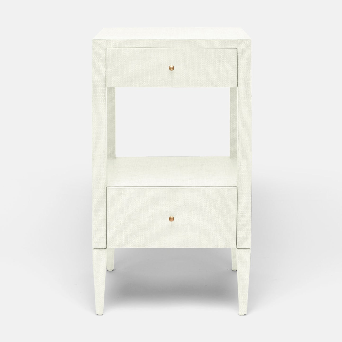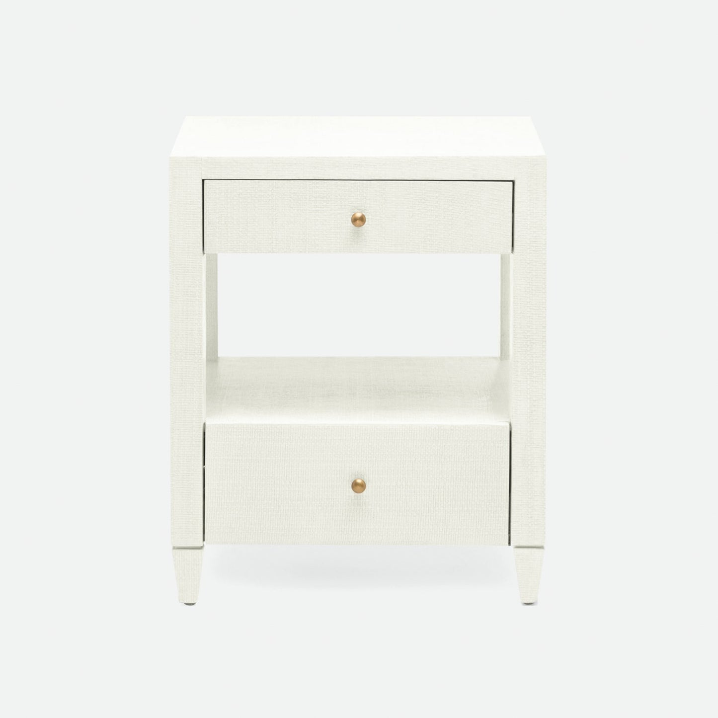 Made Goods Conrad Single Nightstand in Pristine White Faux Raffia features self-closing drawers and faux raffia textured finish, making this bedside table a must-have for your home. Clean contemporary lines deliver style and versatility with two drawers accented with brass knobs and an open shelf for storage.