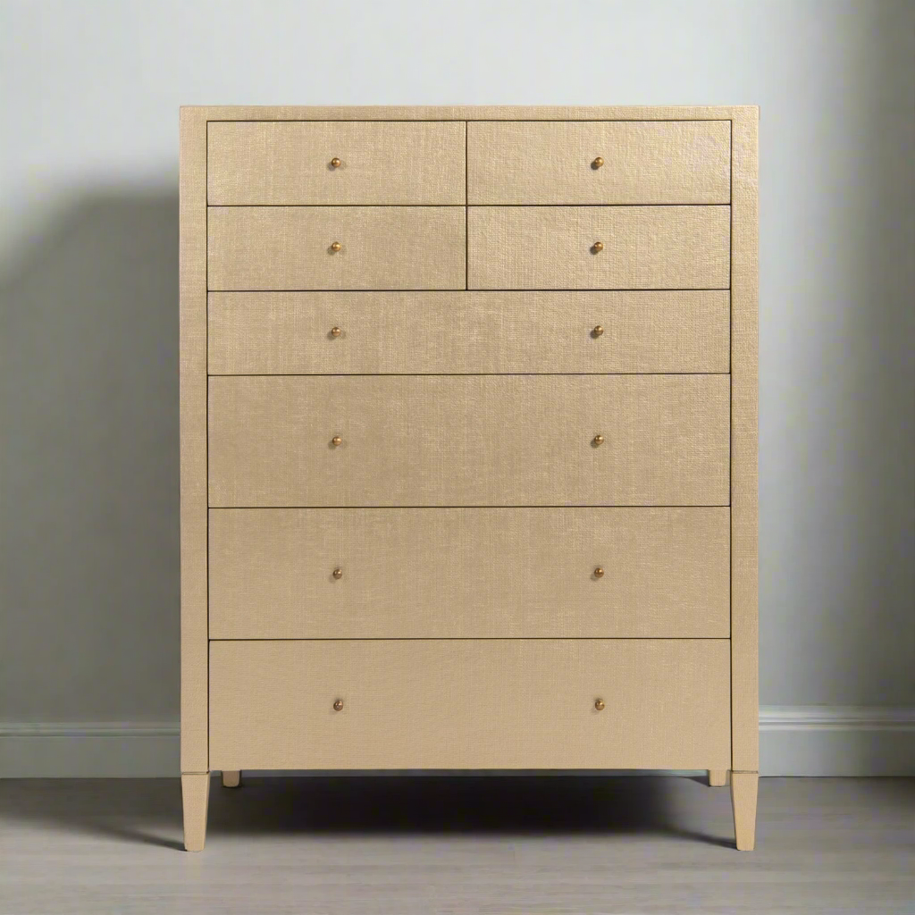 The Conrad Tallboy in Champagne Raffia from Made Goods combines design with functionality. The tallboy is covered in glamorous faux raffia and has eight wood-linen drawers offering ample storage.