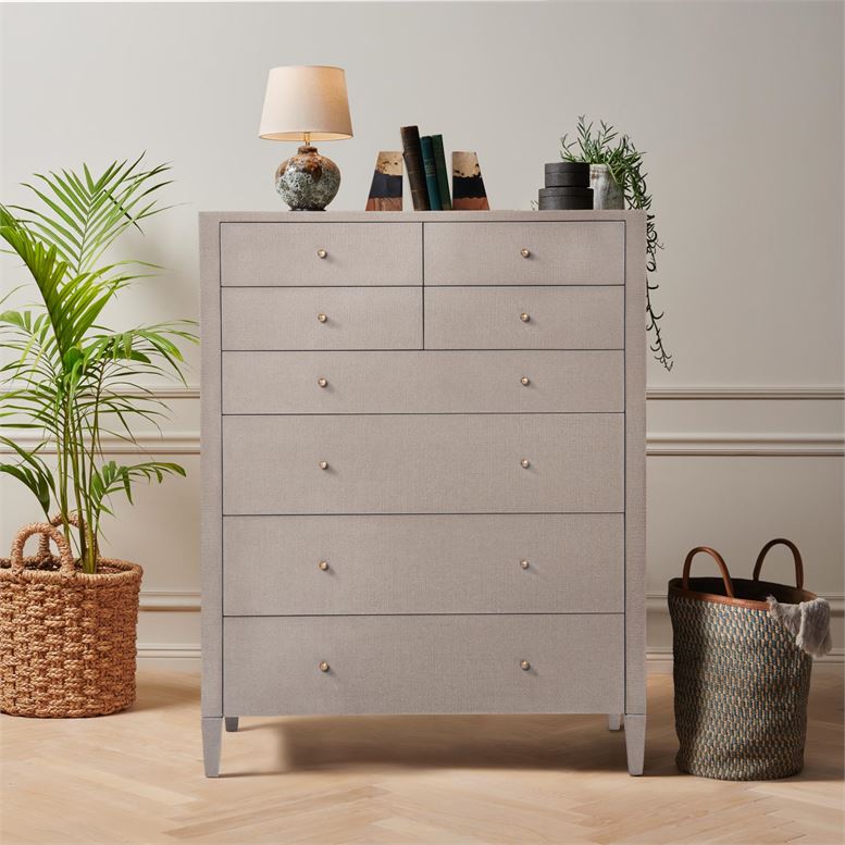 The Conrad Tallboy in Seal Raffia from Made Goods combines design with functionality. The tallboy is covered in glamorous faux raffia and has eight wood-linen drawers offering ample storage.