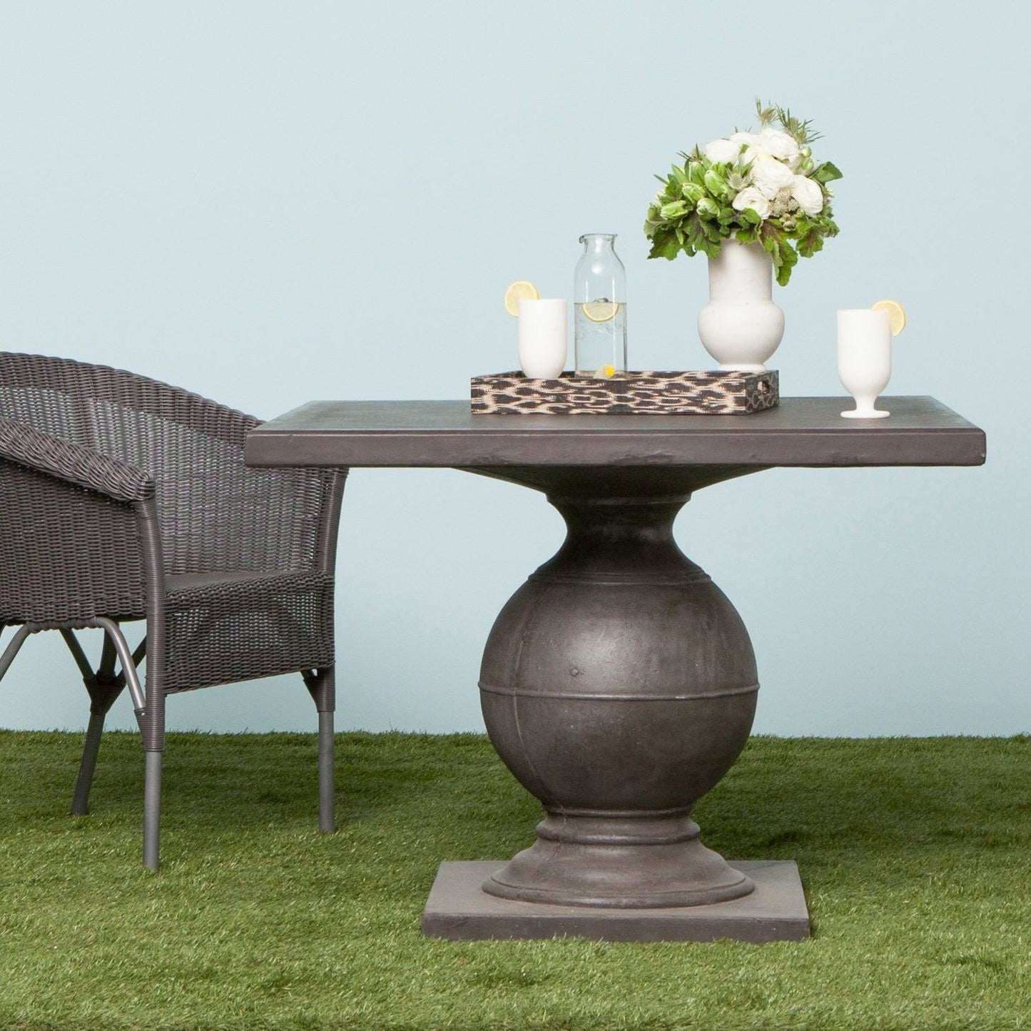 The Cyril Square Dining Table in Midnight Gray Reconstituted Stone from Made Goods makes the ideal centerpiece for outdoor gatherings. Its pedestal stand gives it such an airy feel, you might want another one for inside as well. Concrete material naturally distresses. Minor cracks and imperfections are to be expected.