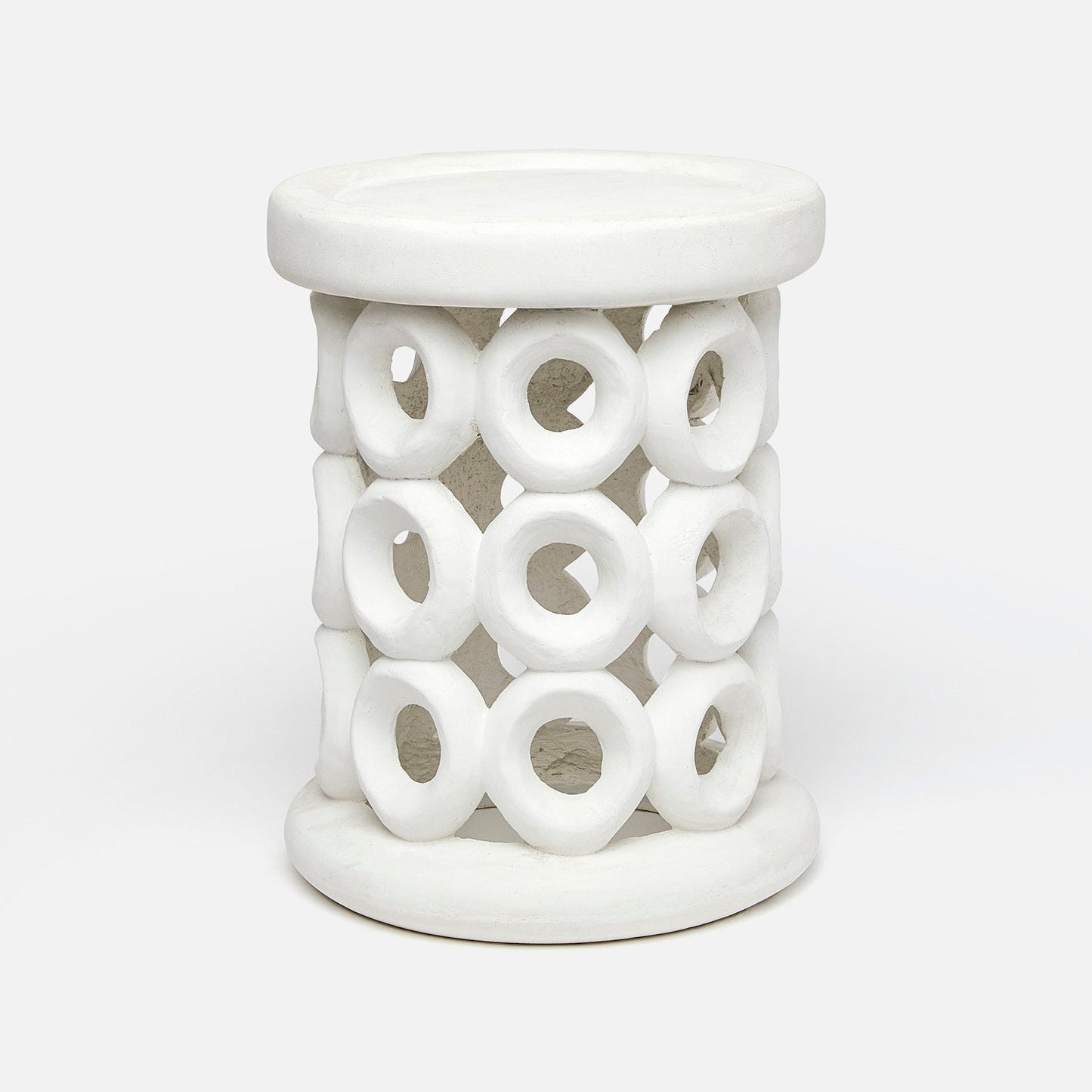 Donut-shaped loops make up the eye-catching graphic structure of the circular Dagen Stool in Flat White Stone from Made Goods. Made entirely of concrete, this versatile accent piece is the perfect addition to an outdoor deck or garden patio.