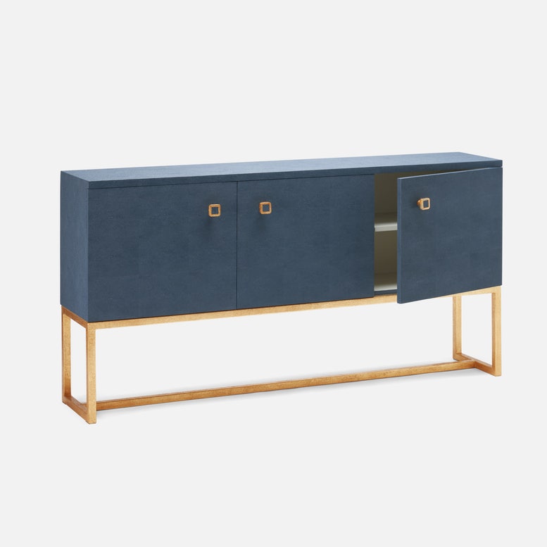 The Dallon Buffet in Navy Faux Shagreen and Gold Steel offers both style and practicality. Its adjustable shelves make it ideal for storing dinnerware, linens, and more. Use it as a home bar or storage cabinet for your home office.
