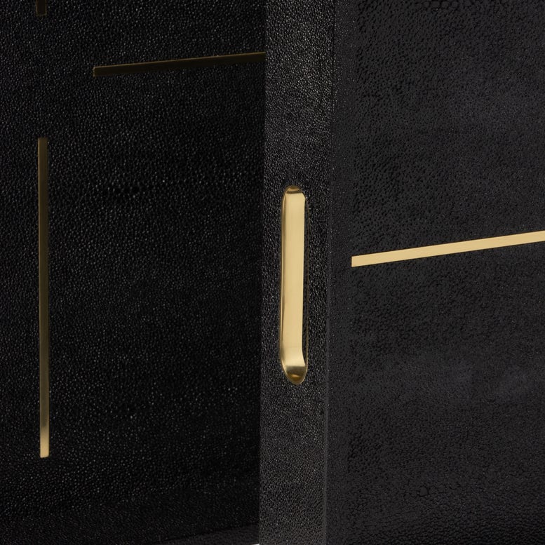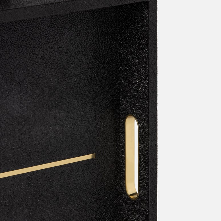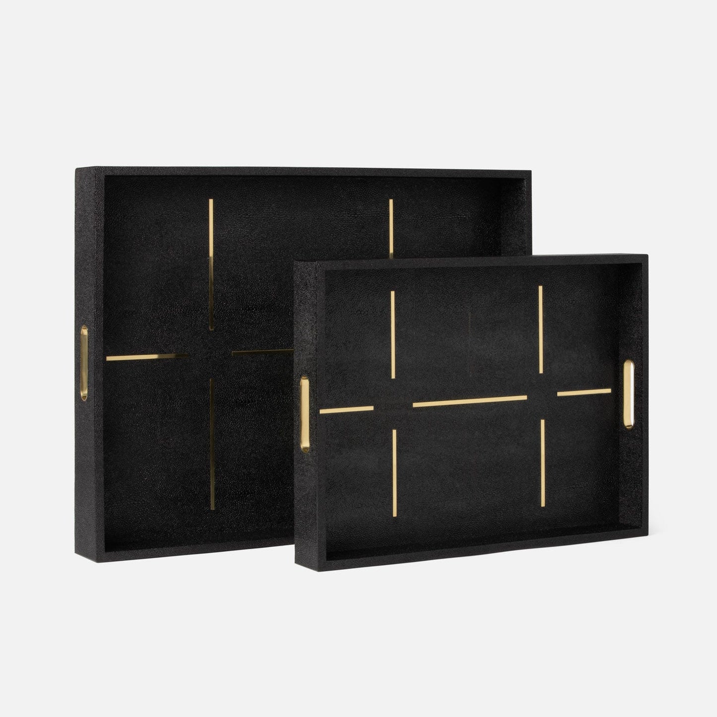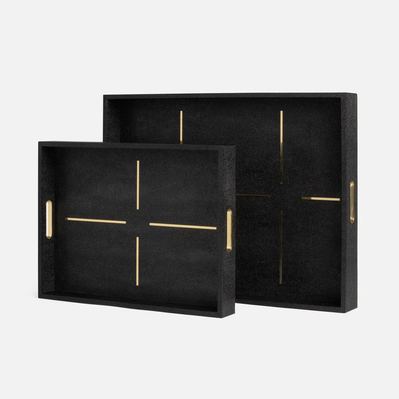 The Daina Tray Set in Black Faux Shagreen by Made Goods features a stunning faux shagreen pattern with elegant brass details and practical handles. Trays like the Daina are an ideal addition to any coffee table.