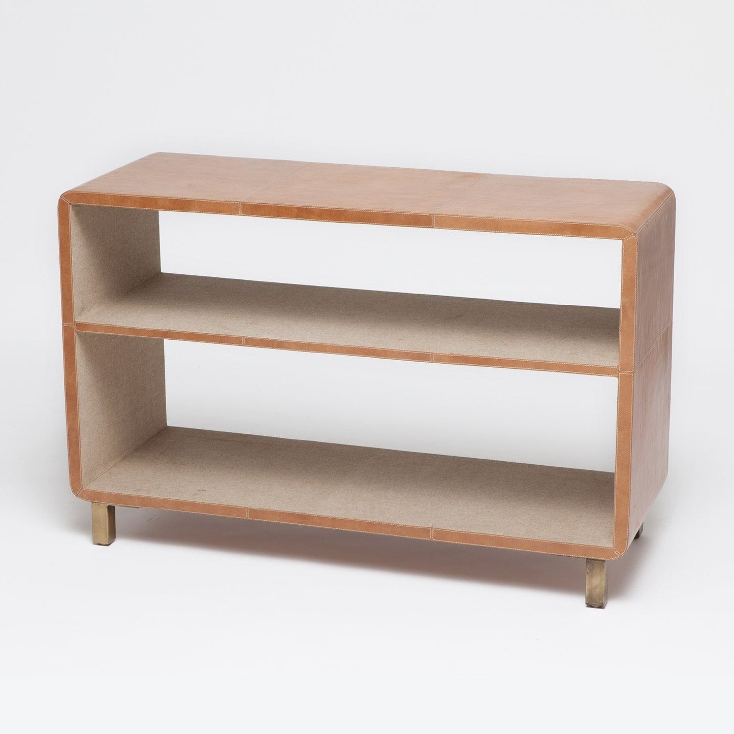 The Dante Bookcase from Made Goods features an aged full grain leather finish in aged camel. The rounded edges add a modern touch to the rectangle shelving. Metal legs and finish off the classic design suitable for office or bedroom organization.