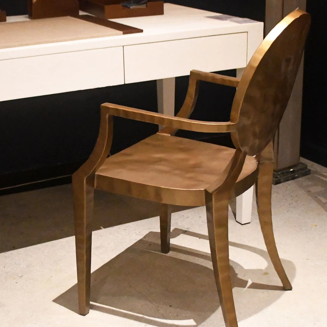 The Daphne Chair from Made Goods is a sophisticated interpretation of Philippe Starck's 'ghost chair'. Crafted from solid hammered gold iron, the Daphne Chair offers a substantial weight to this timeless design. Inspired by the French Louis XV style, the original armchair design by Starck features a traditional round back.