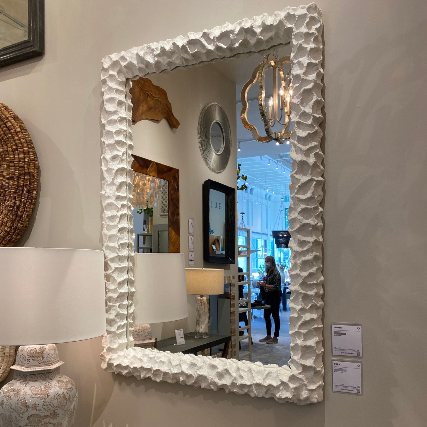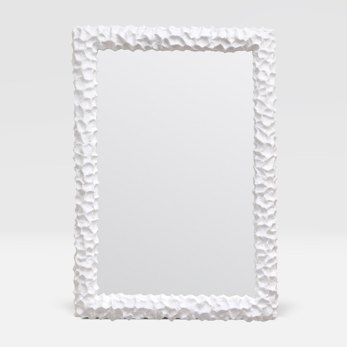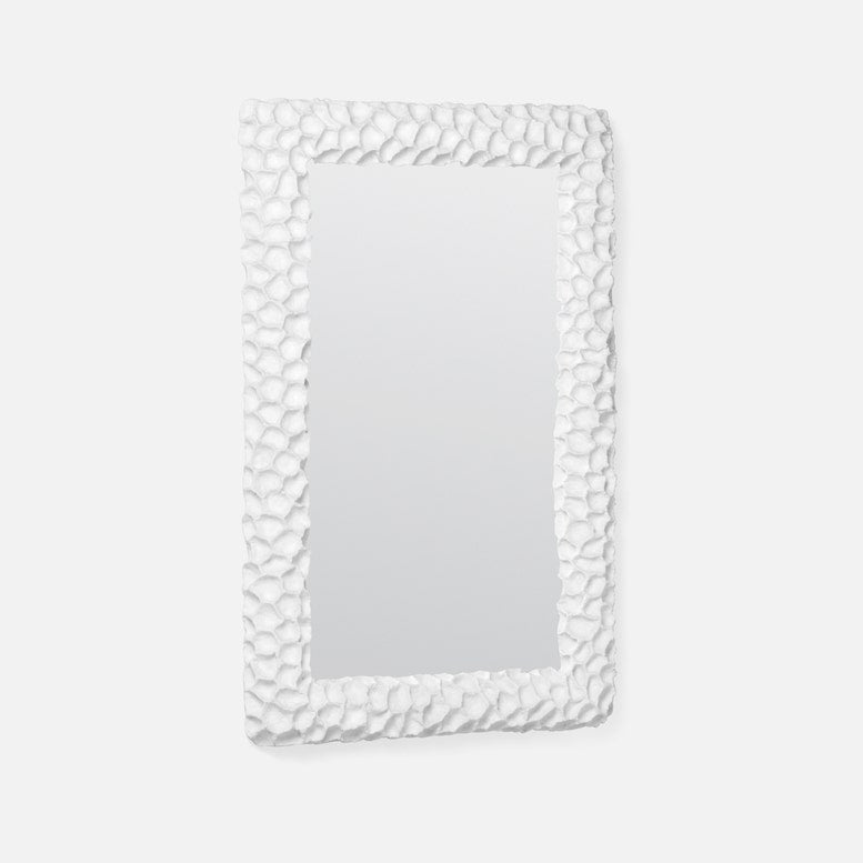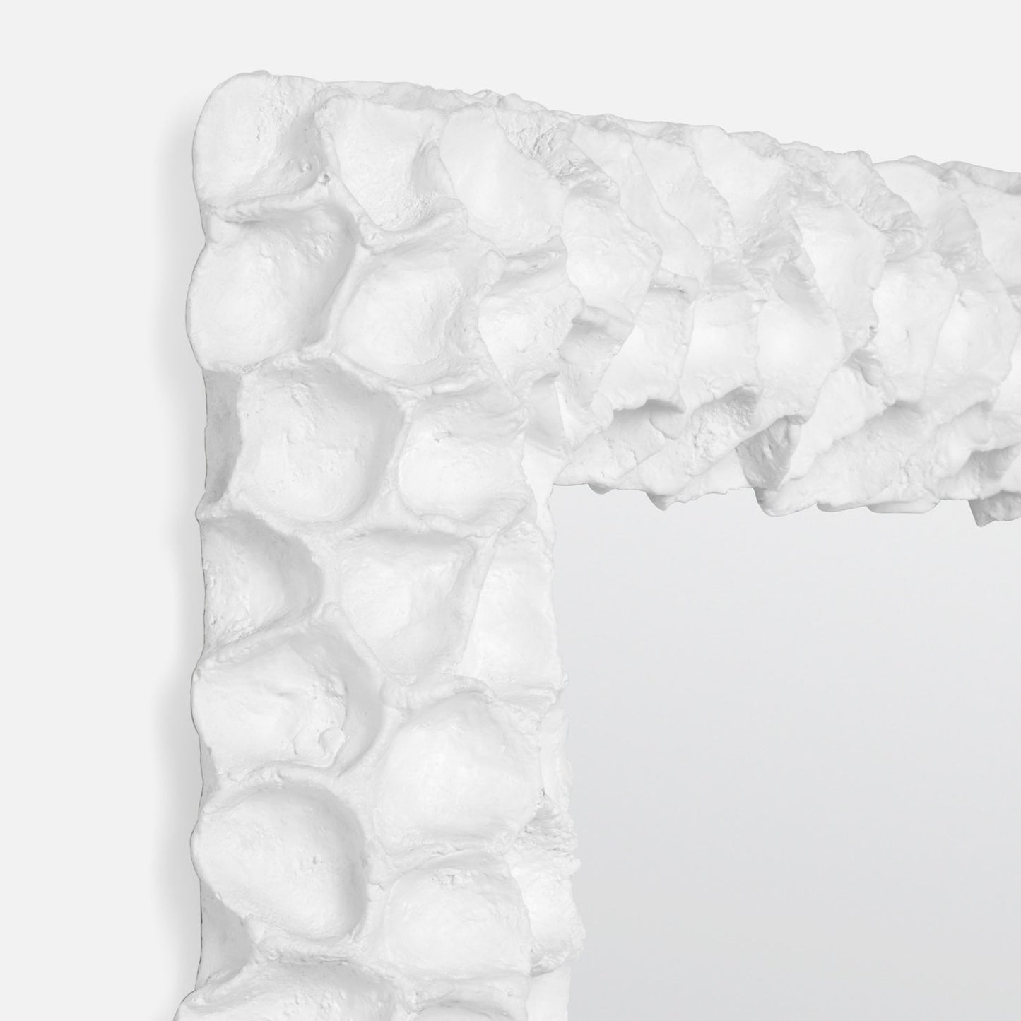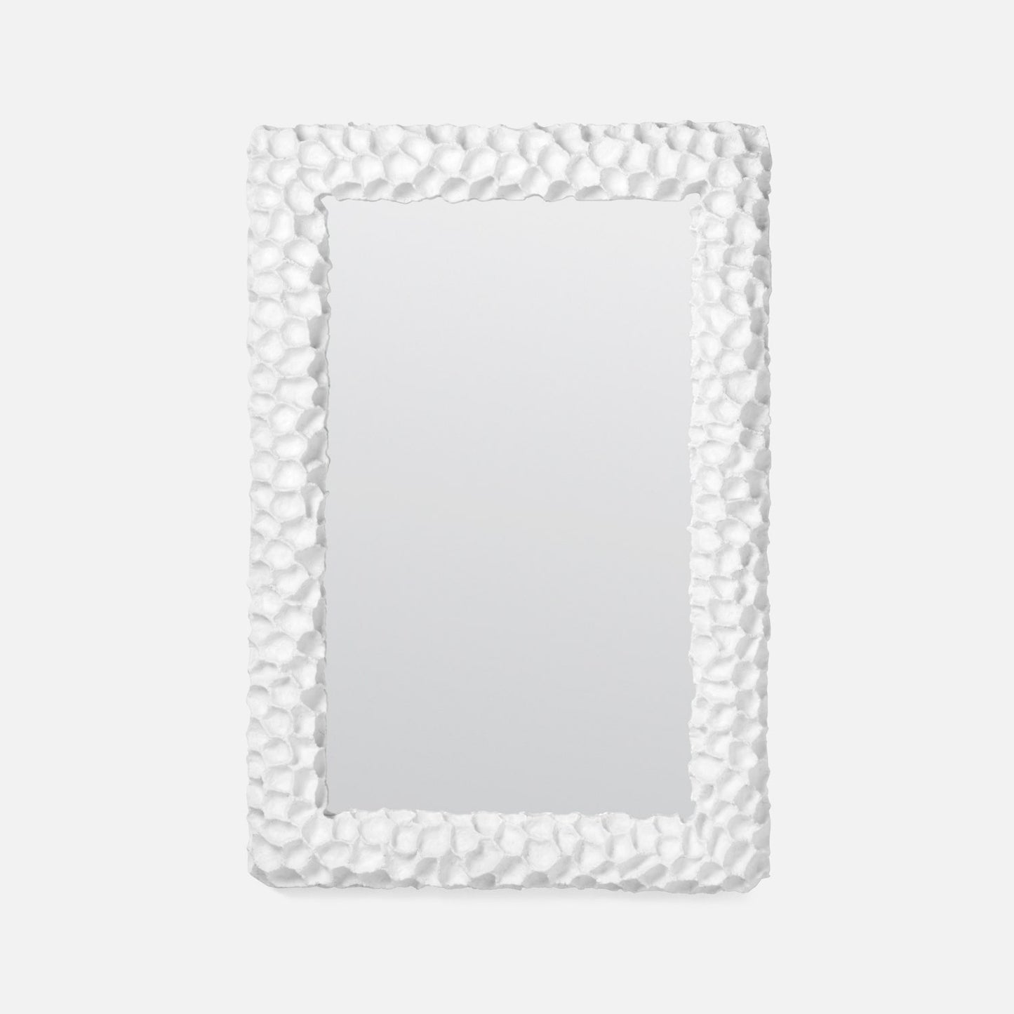 The Made Goods Dara Mirror in White Plaster Resin offers a blend of contemporary and beachy styles with a textured frame and white gesso finish. This mirror's geometric design adds an abstract element to the coral-inspired aesthetic, resulting in a modern and unique look.