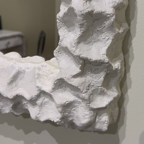 The Made Goods Dara Mirror in White Plaster Resin offers a blend of contemporary and beachy styles with a textured frame and white gesso finish. This mirror's geometric design adds an abstract element to the coral-inspired aesthetic, resulting in a modern and unique look.