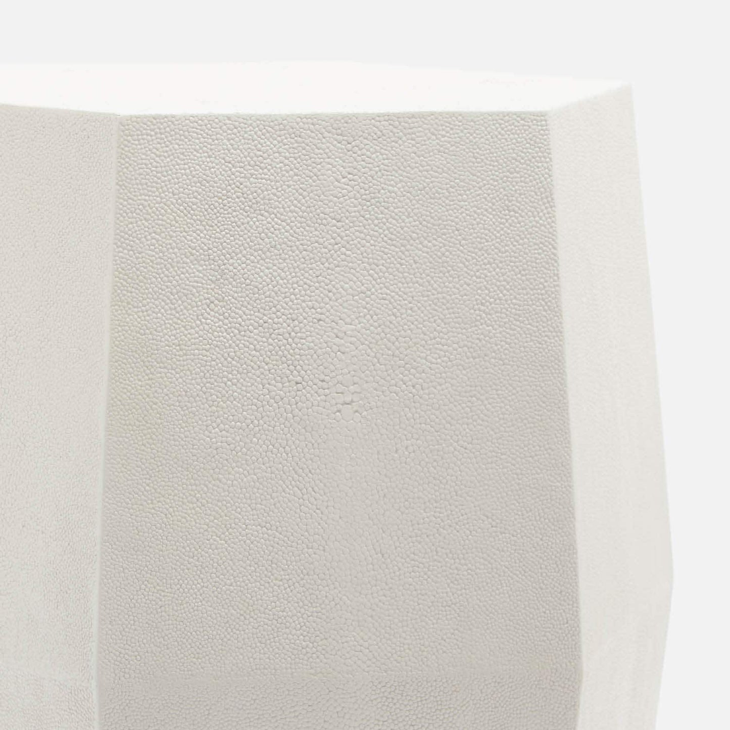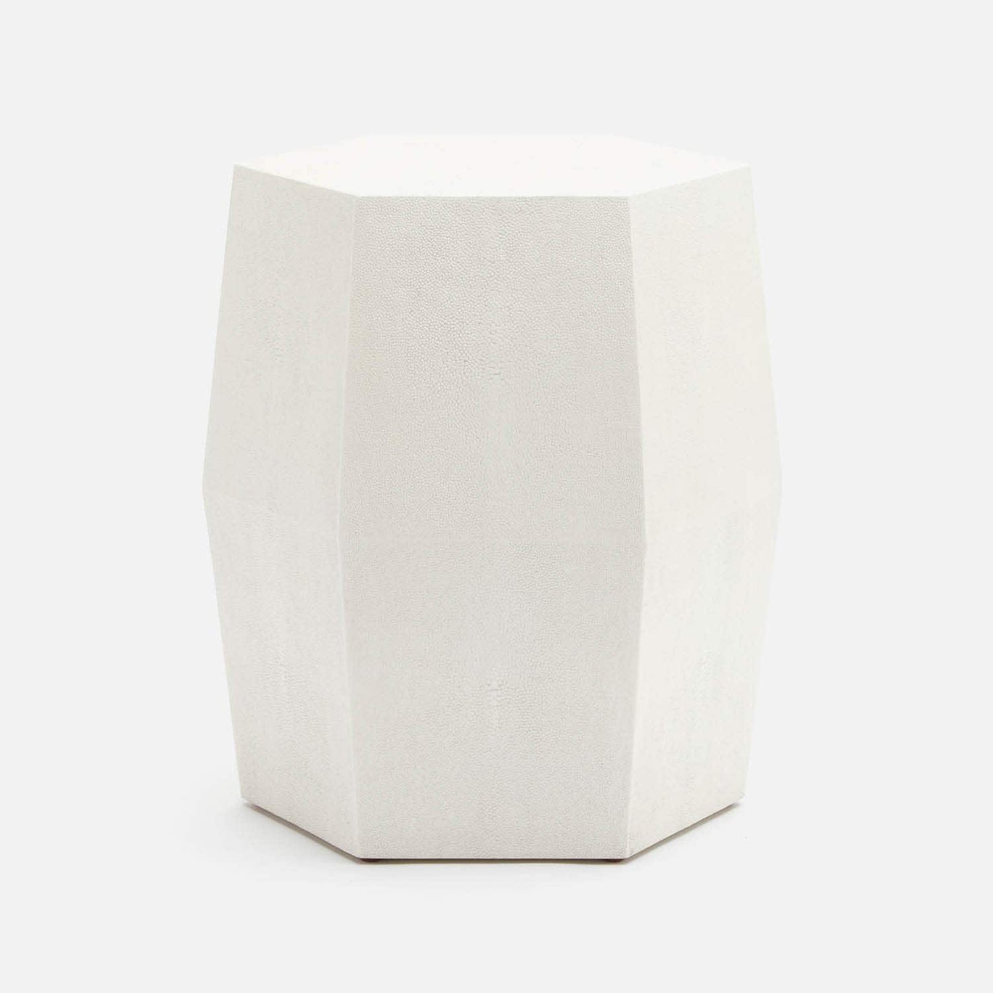 The Made Goods Daryl Stool in Pristine Faux Shagreen reflects a modern contemporary hexagon style. The Daryl is just as functional as extra seating in your home or office as it is when used as a side table next to an occasional chair.