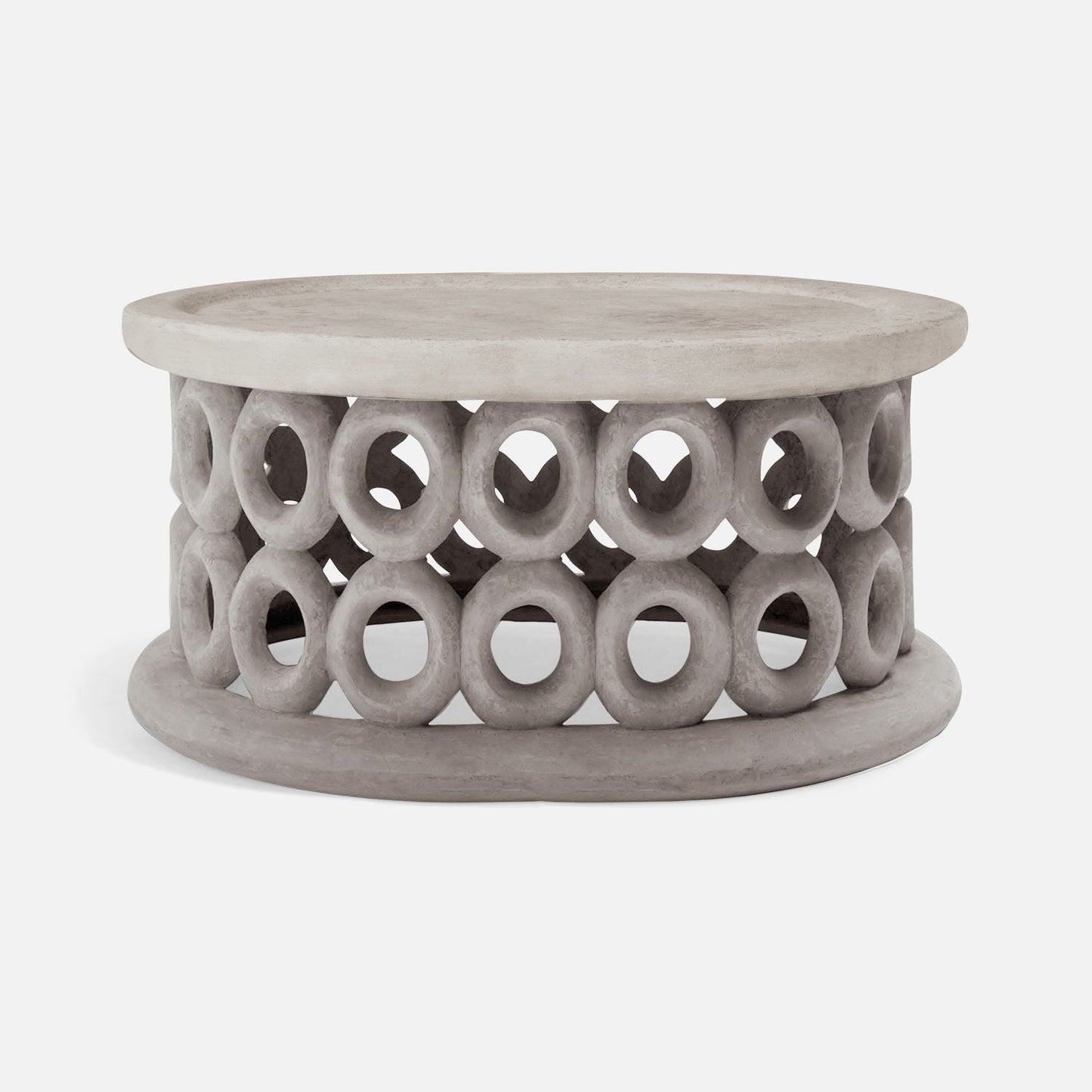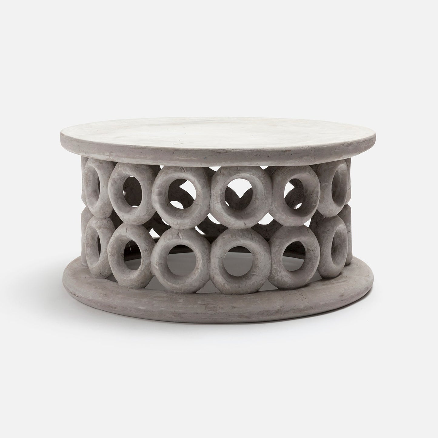 Donut-shaped loops make up the eye-catching graphic structure of the circular Dagen Coffee Table in Light Gray Stone from Made Goods. Made entirely of concrete, this hefty coffee table is the perfect addition to an outdoor deck or garden patio.
