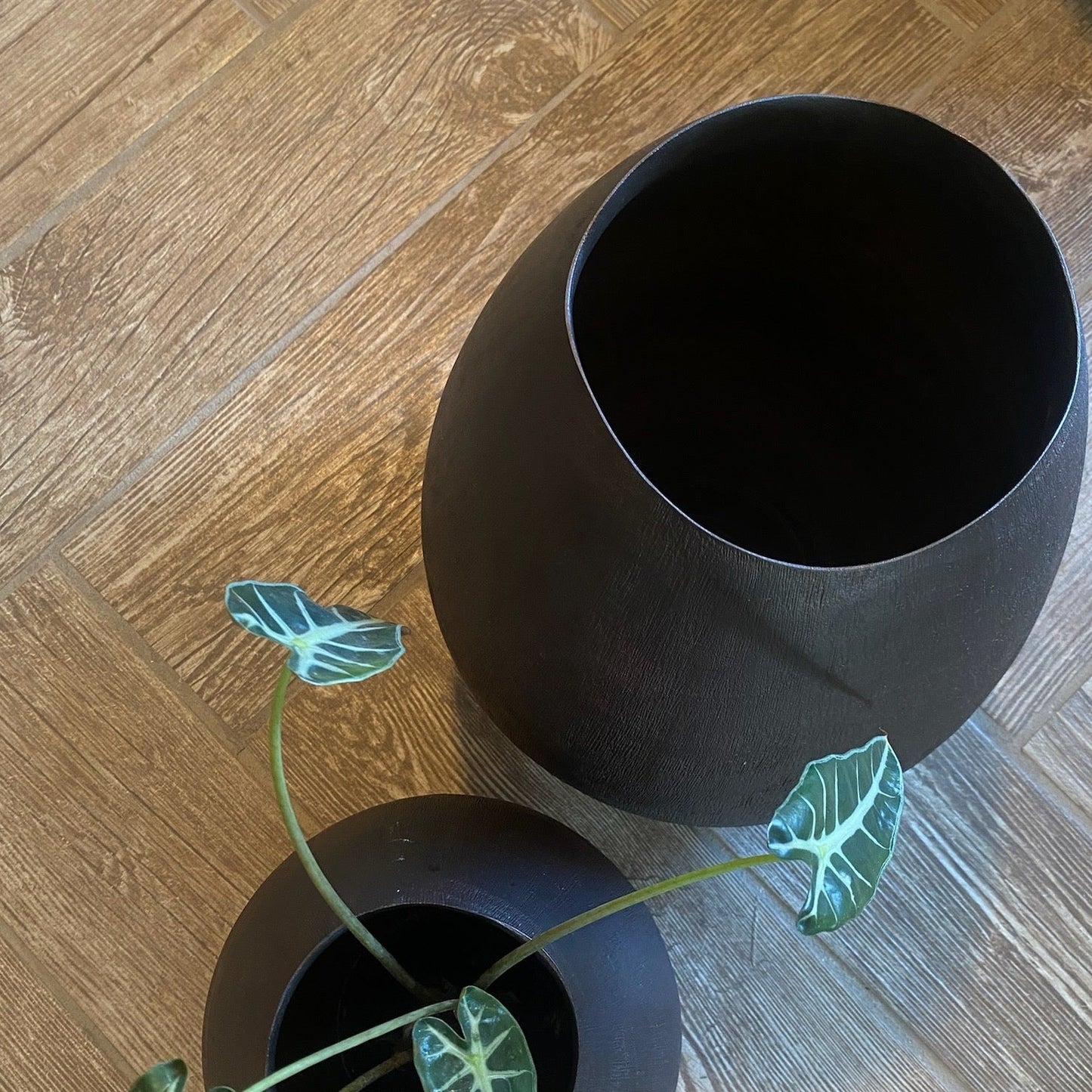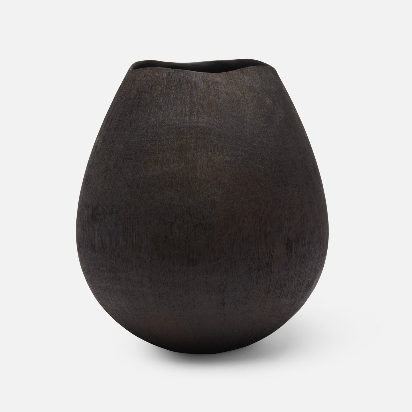 This Dark Brown Mango Wood Delia Vase Set features an egg-shaped design with an irregular edge. Expertly hand-carved from near-black stained mango wood, it adds a touch of sophistication when displayed on a shelf or coffee table. Variations to be expected.